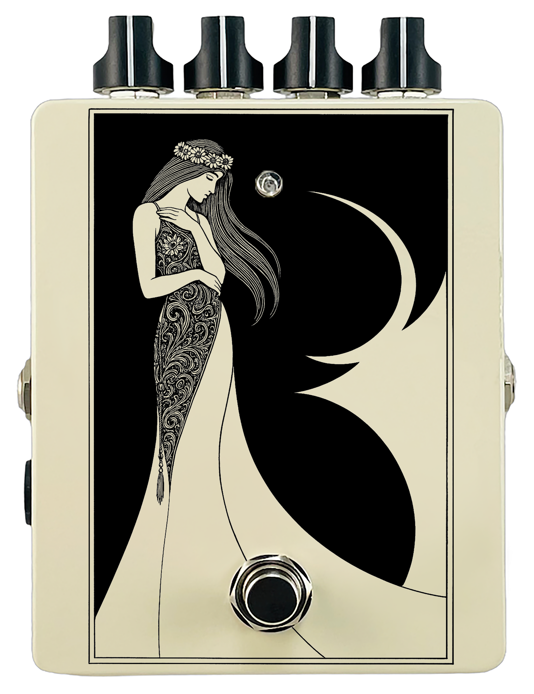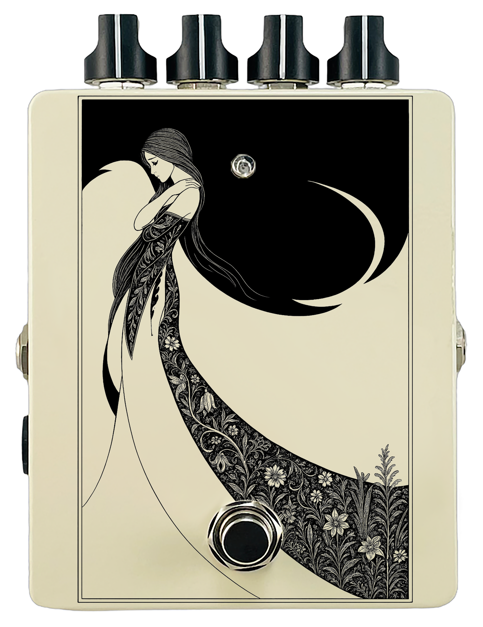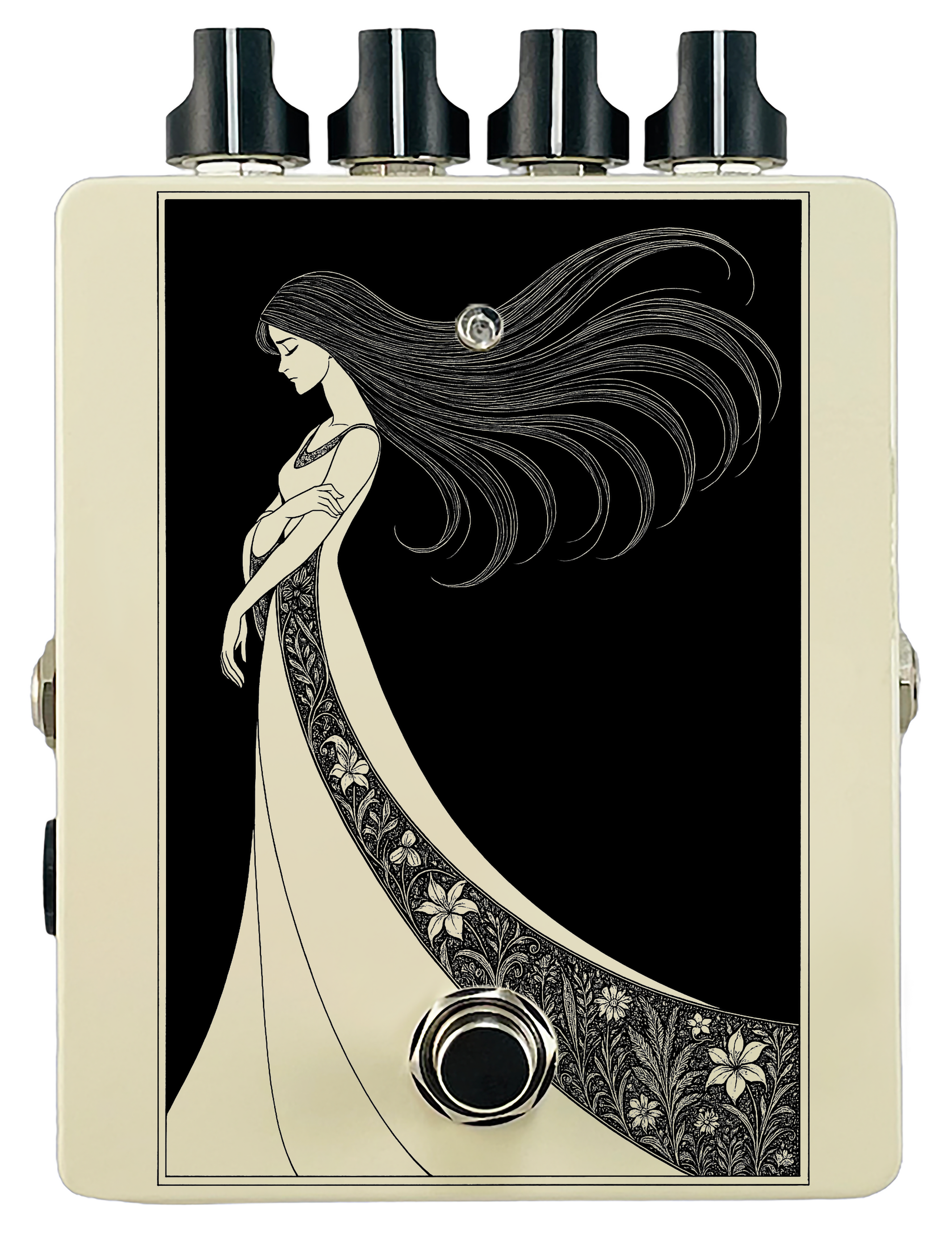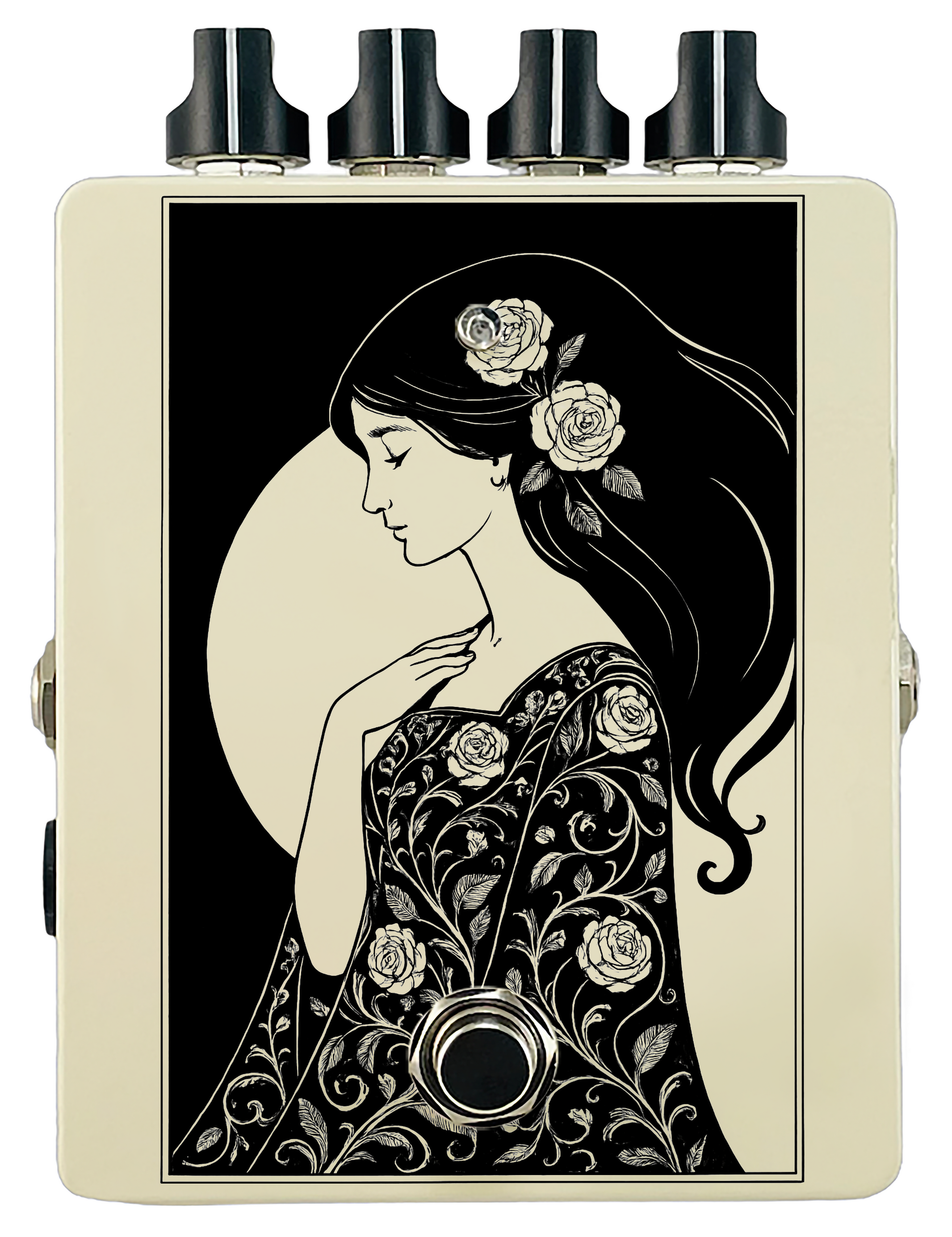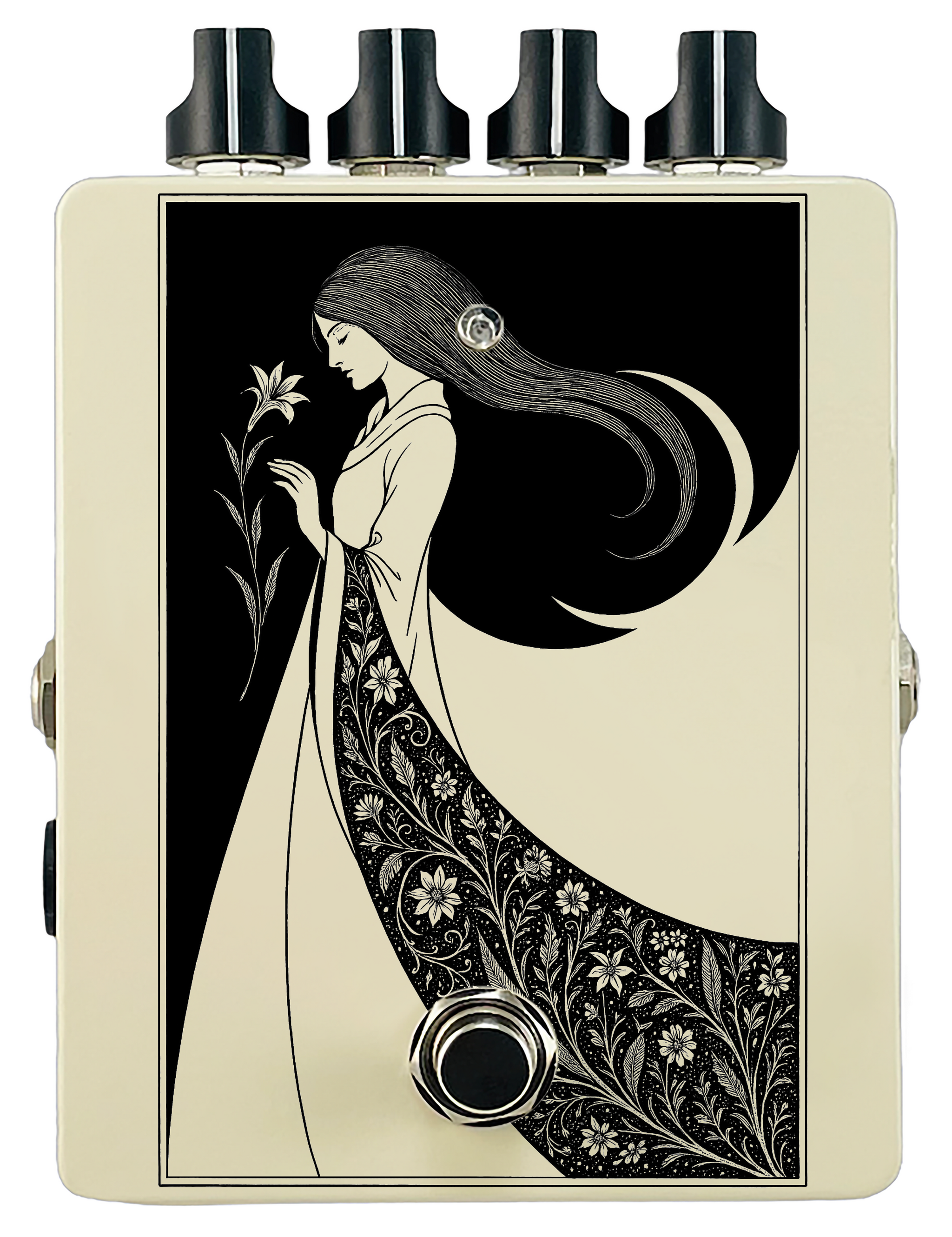 Each pedal features a unique one off piece of art drawing from the line art styles of the great Art Nouveau line artists.