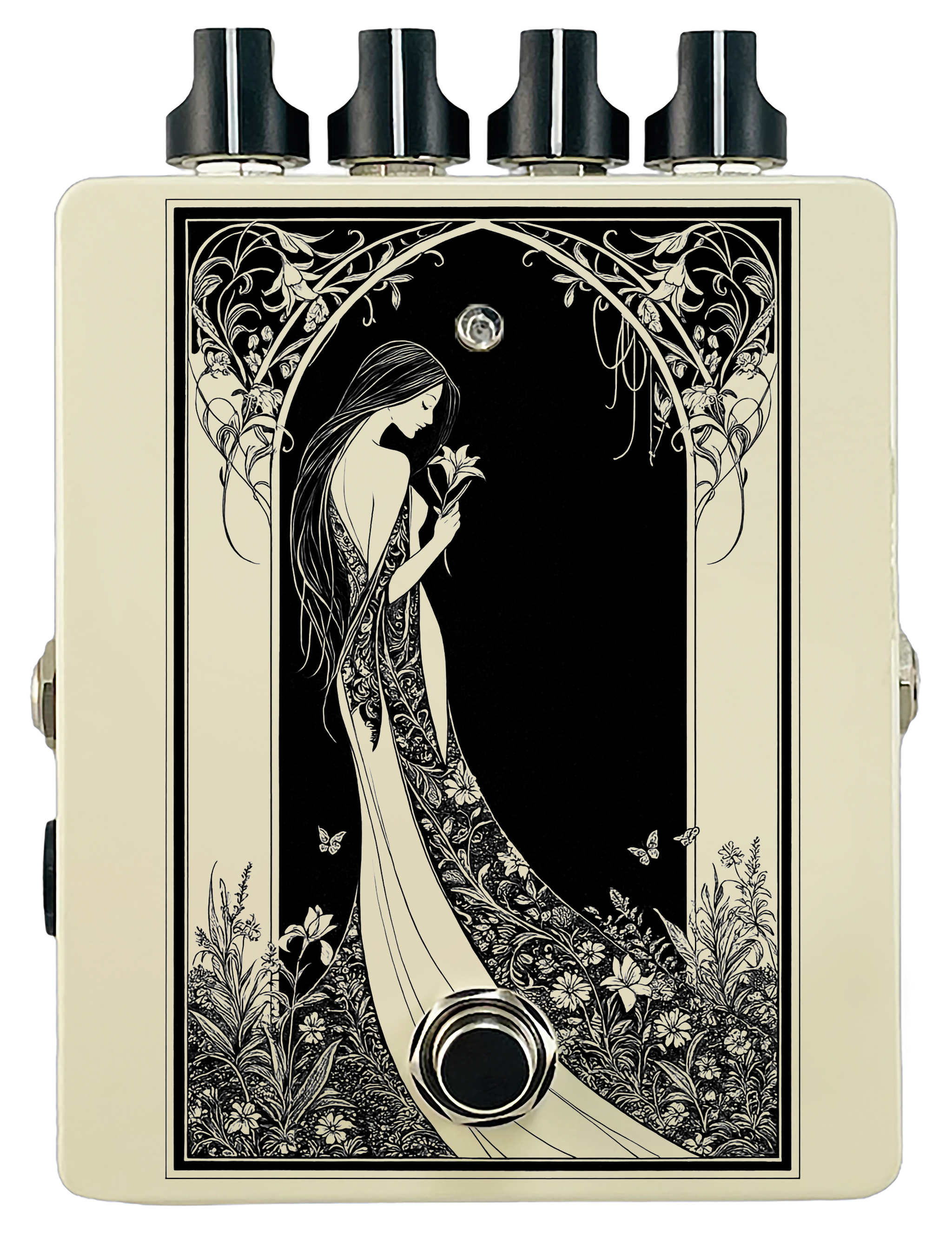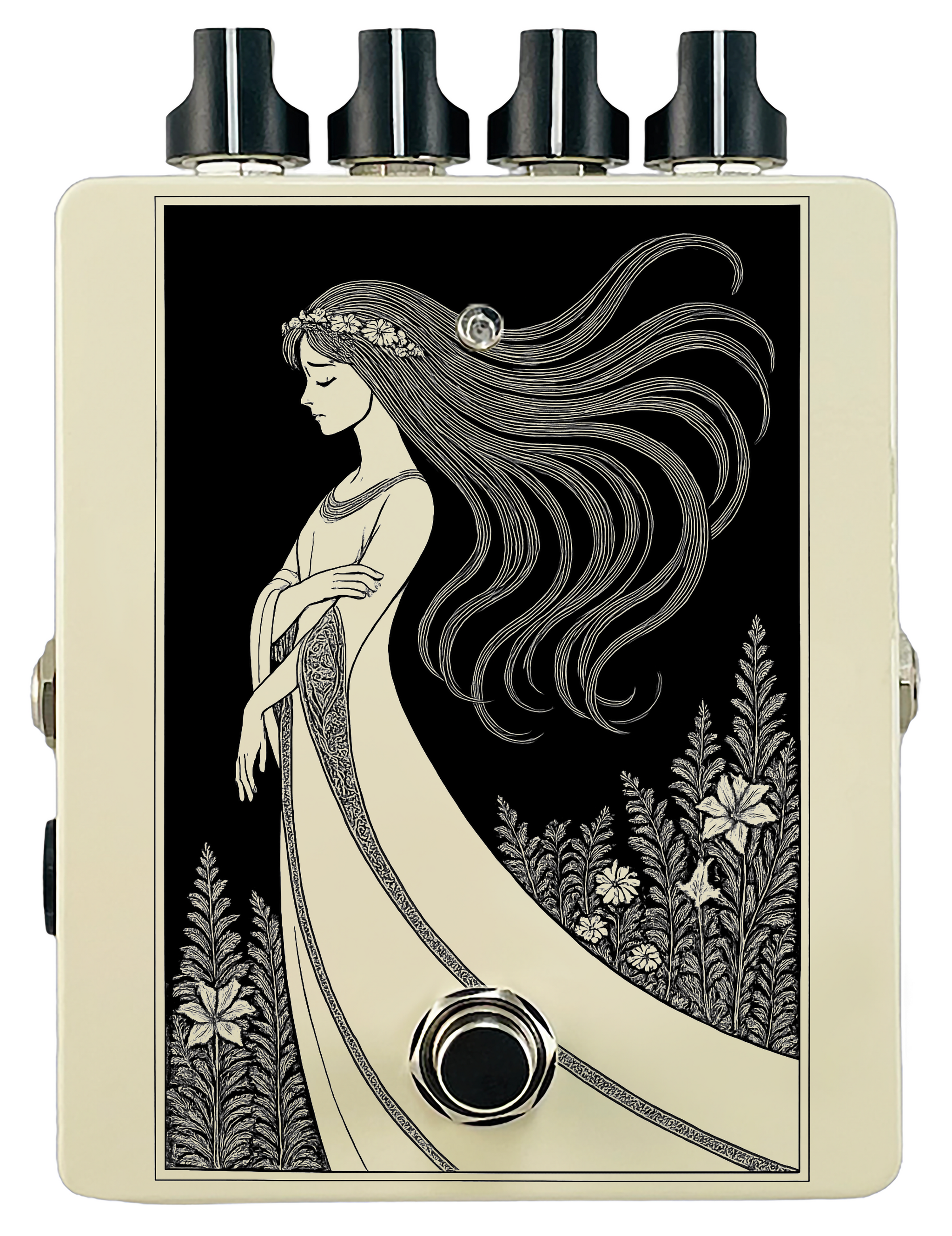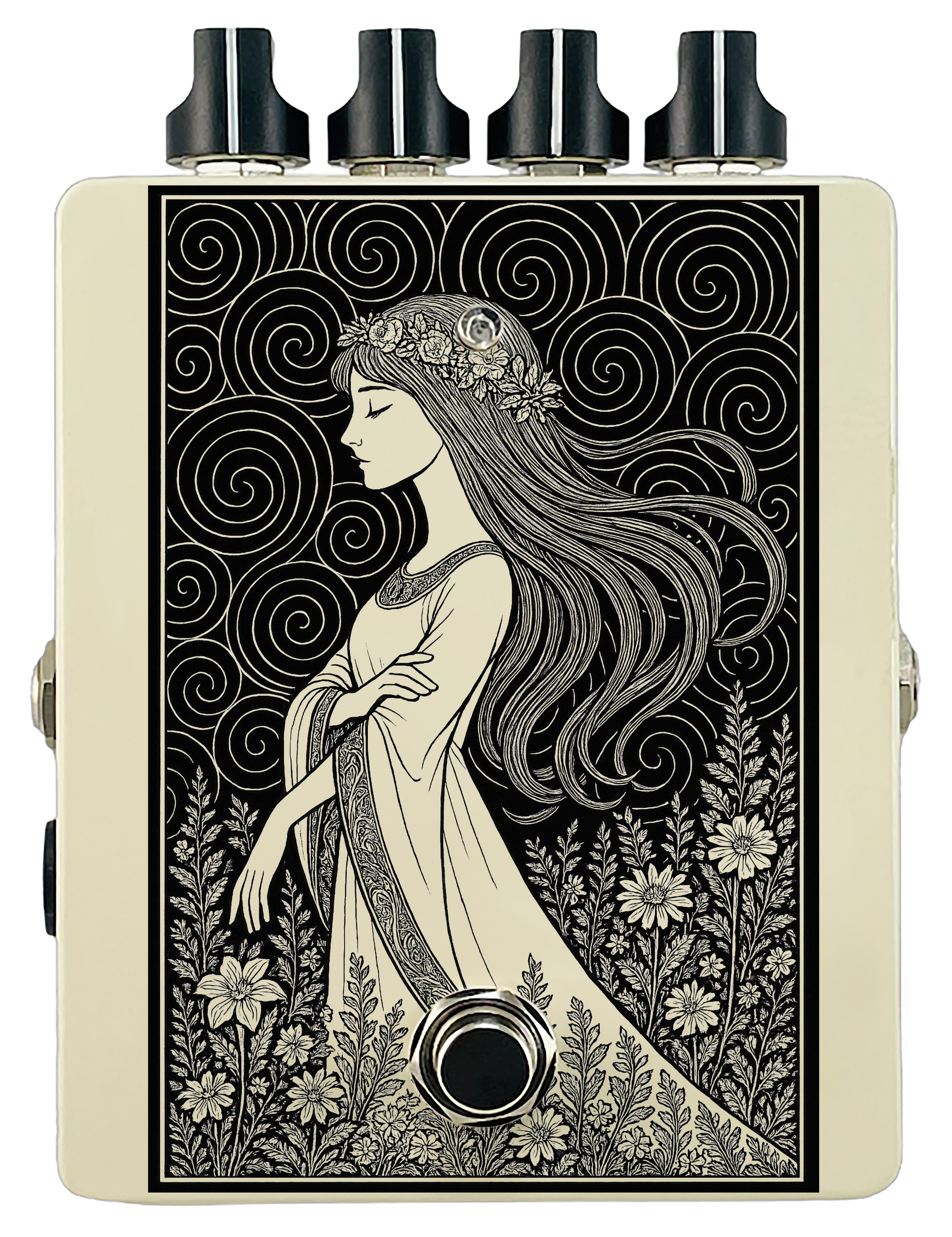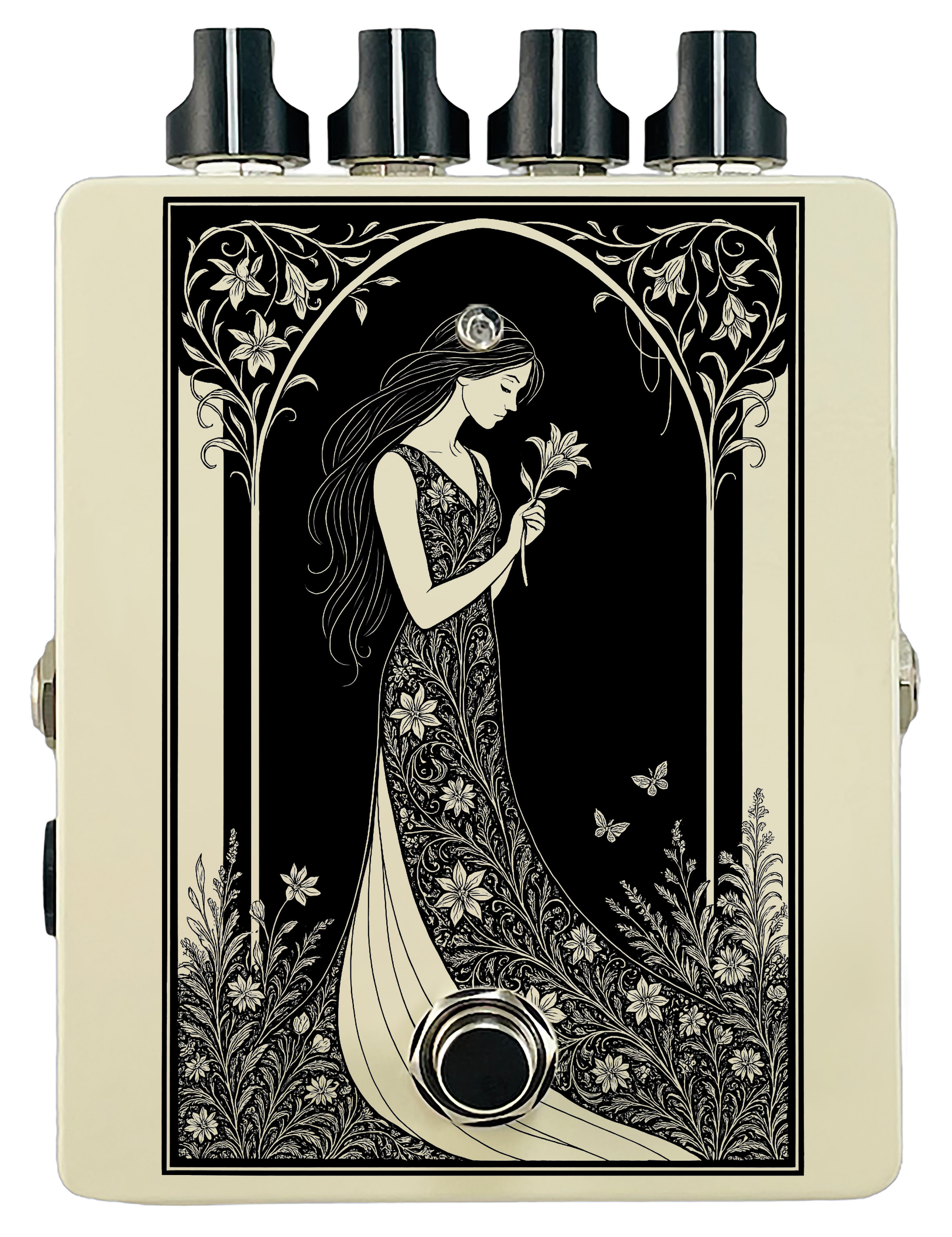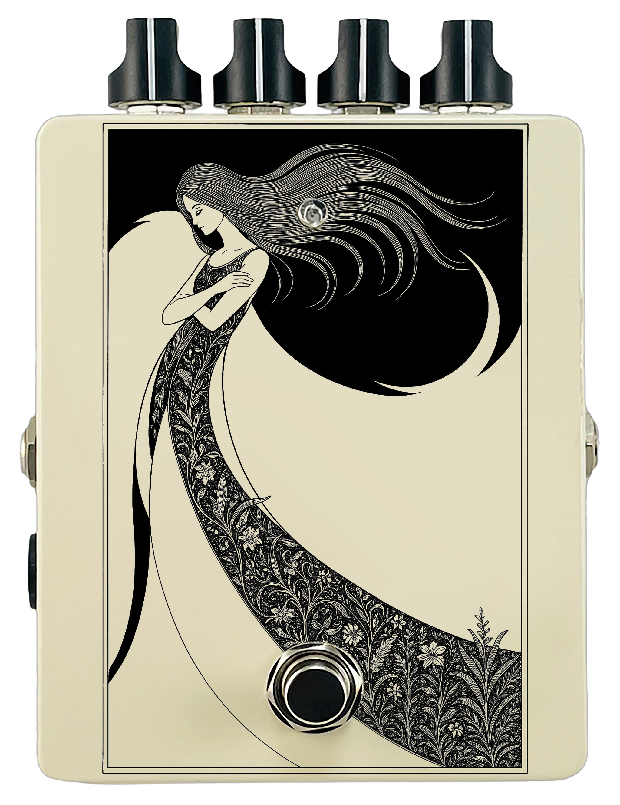 Each pedal features a unique one off piece of art drawing from the line art styles of the great Art Nouveau line artists.