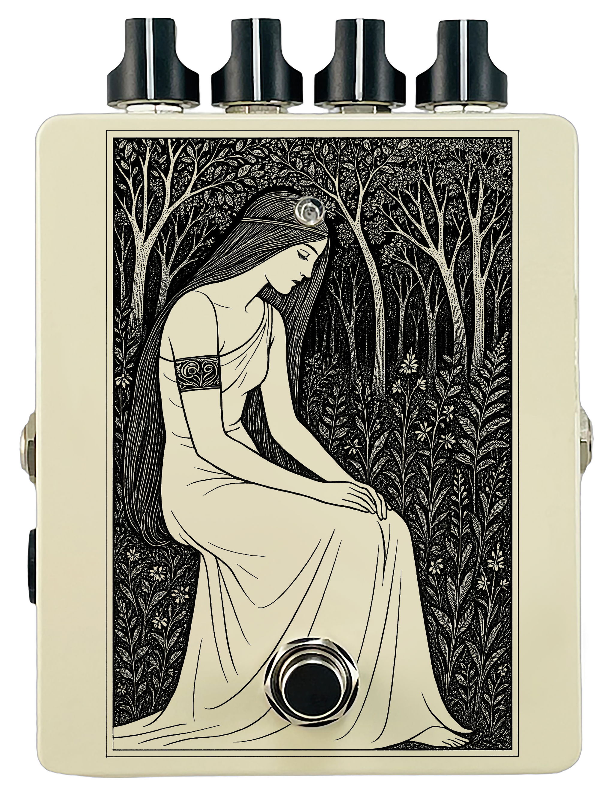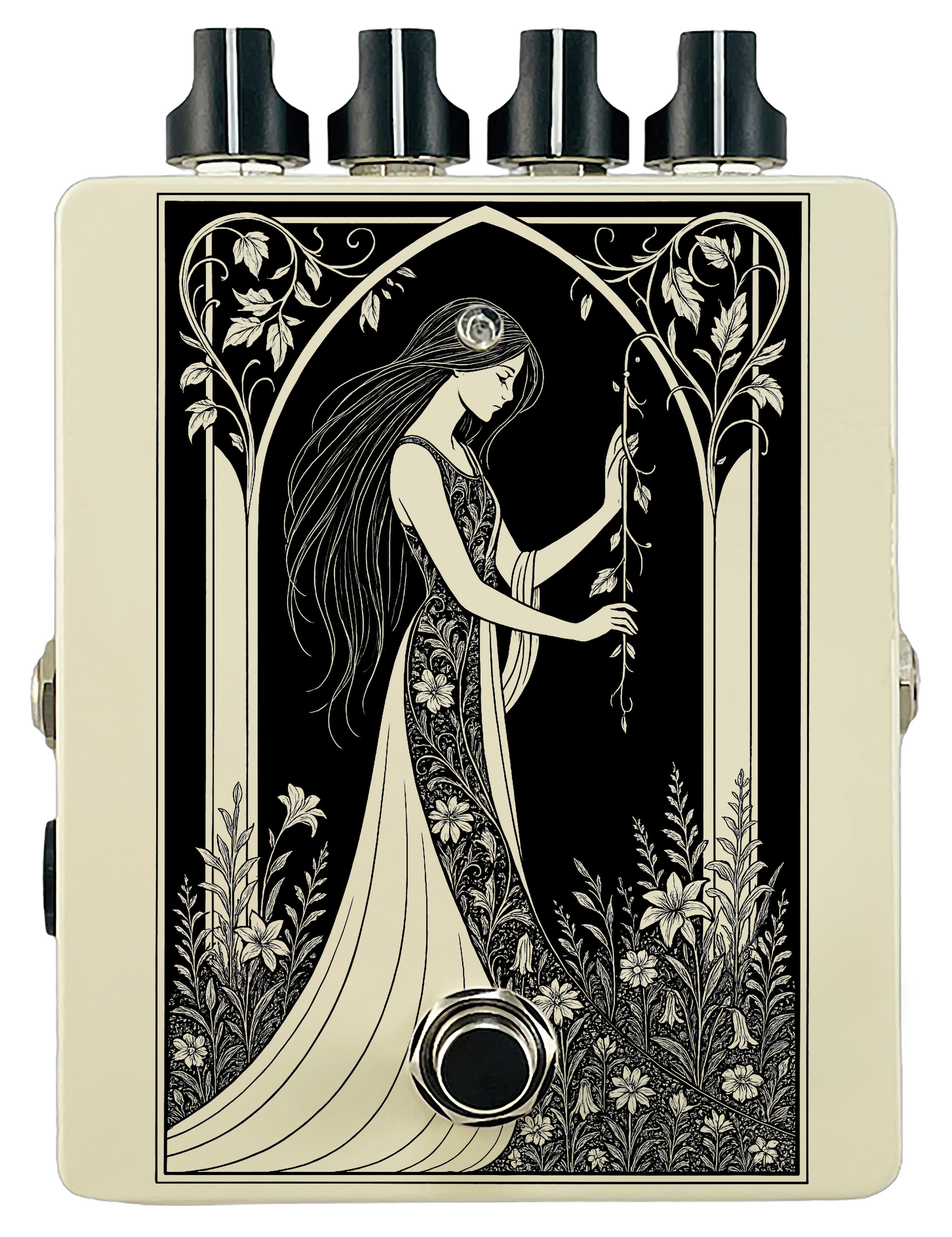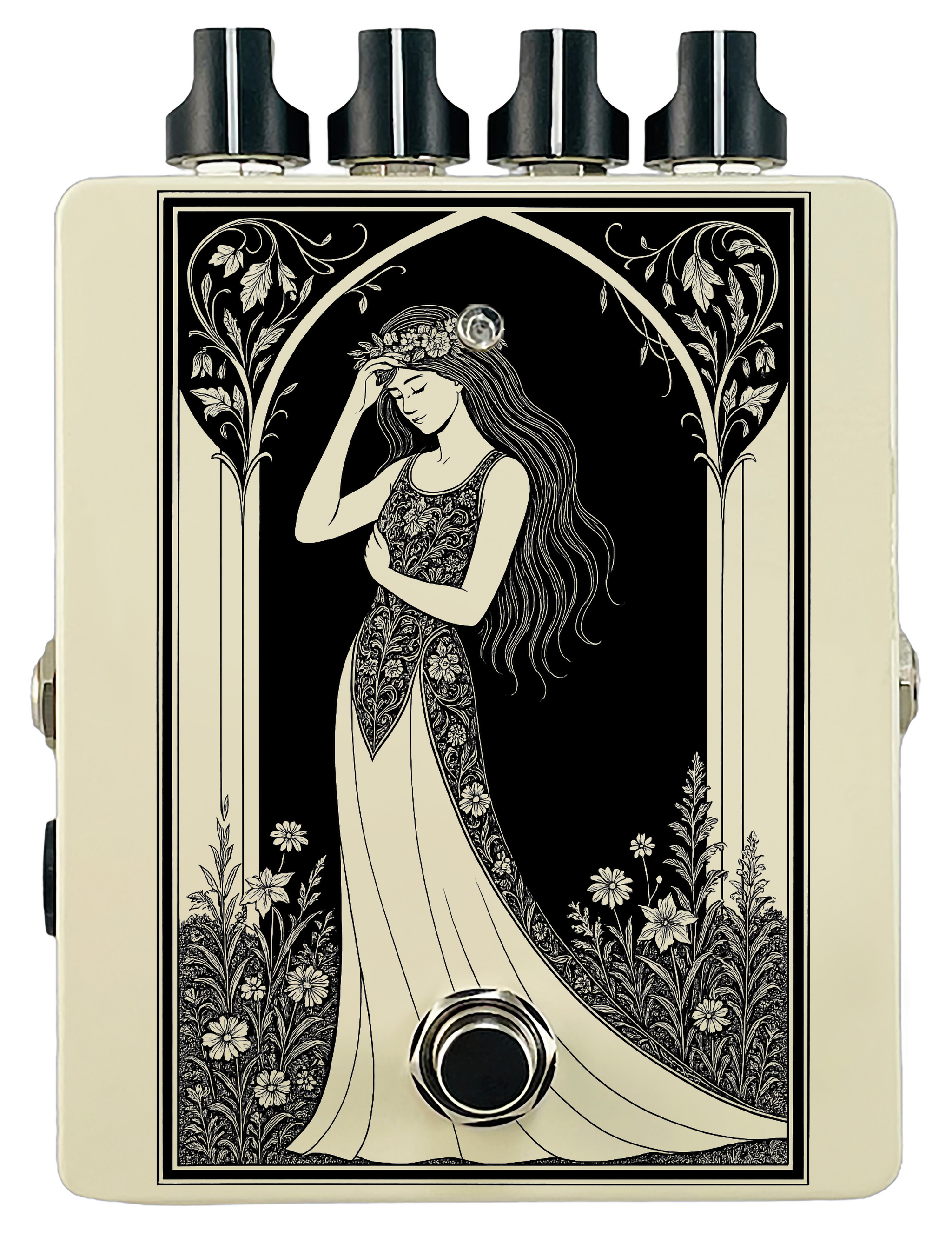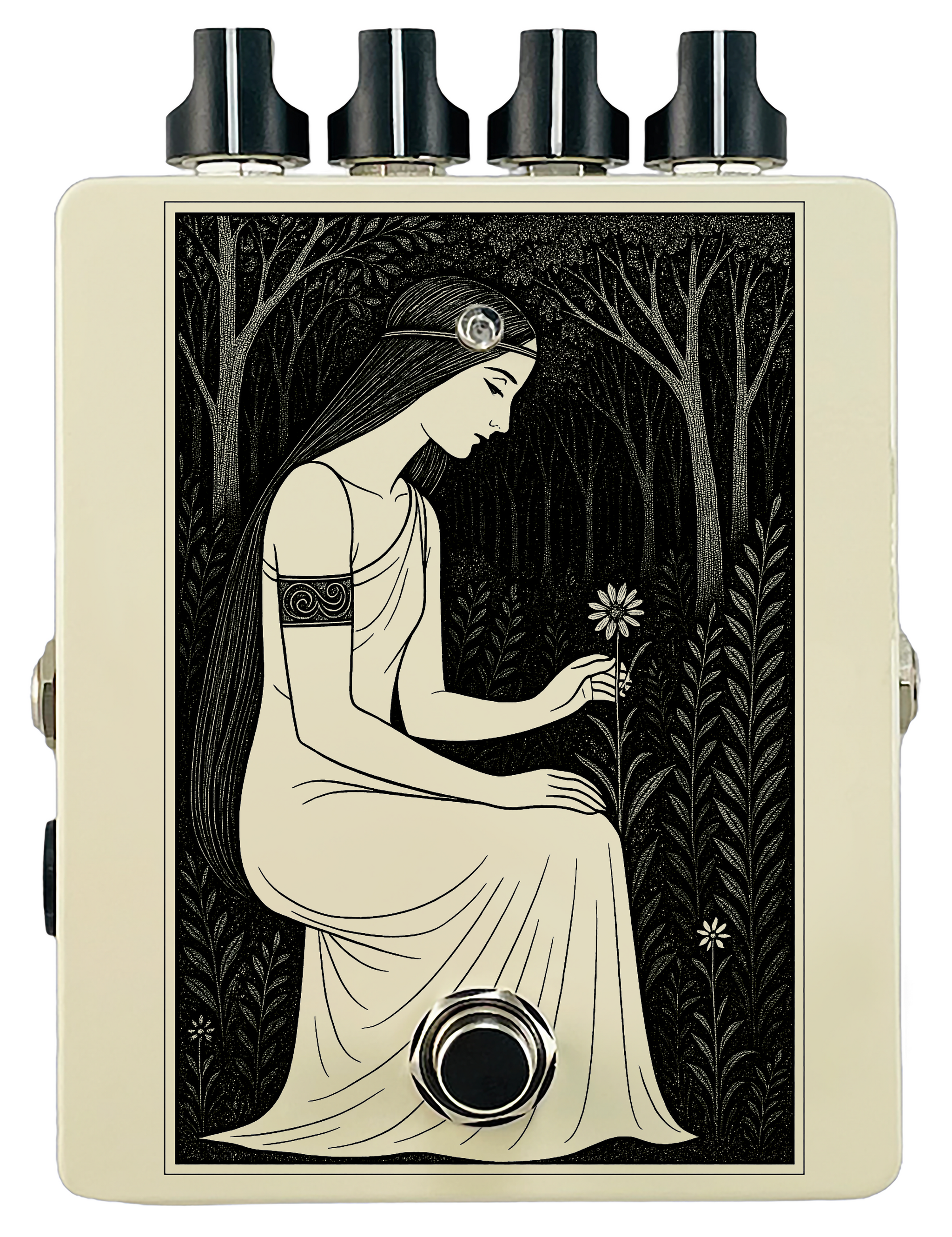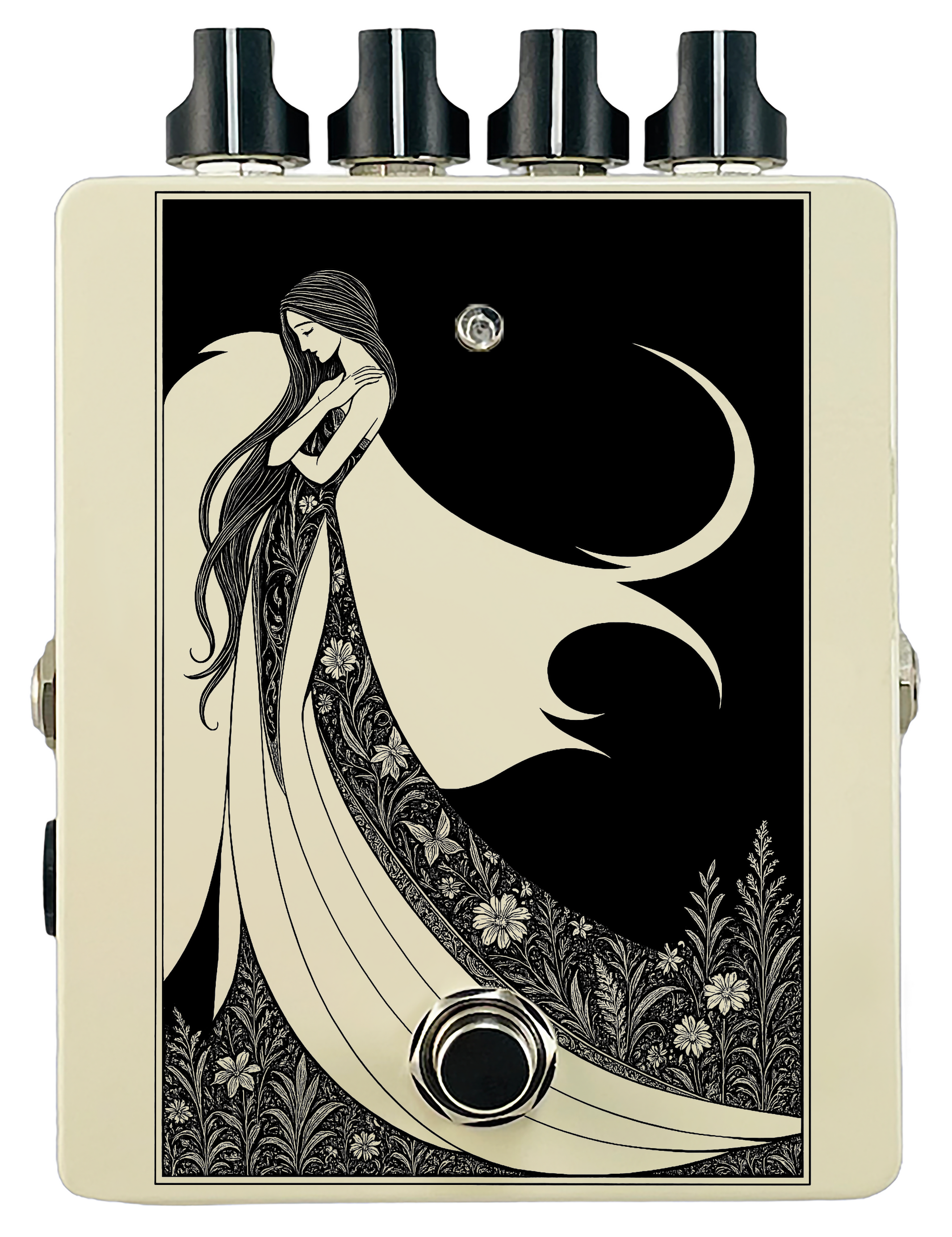 Each pedal features a unique one off piece of art drawing from the line art styles of the great Art Nouveau line artists.