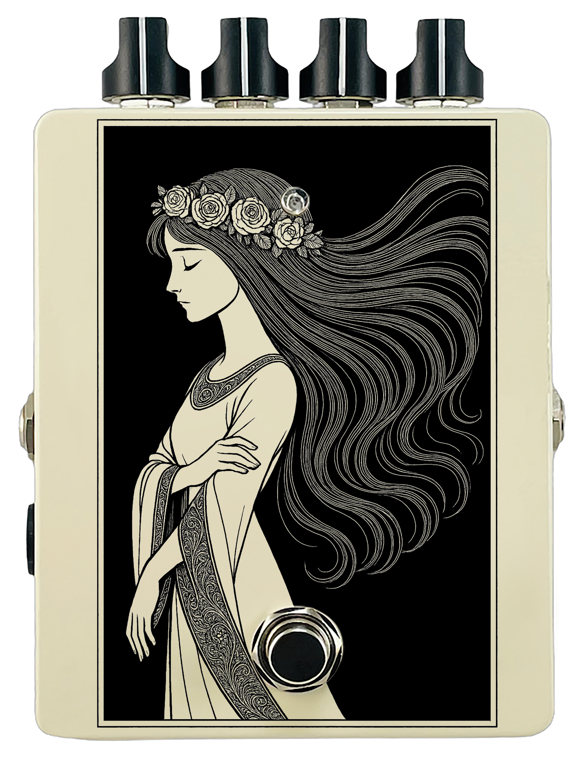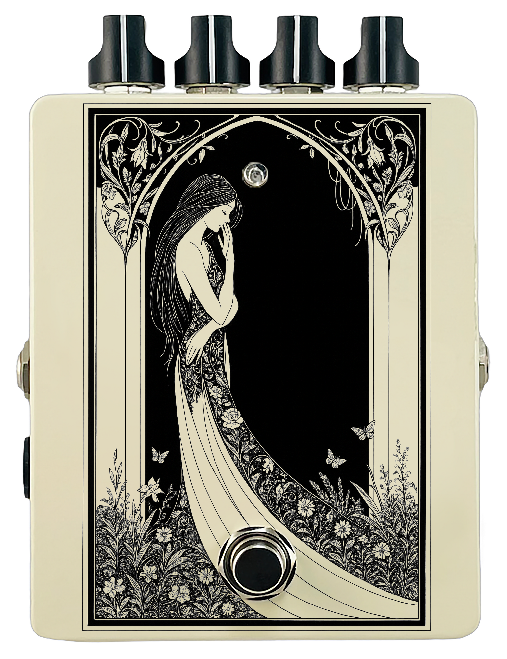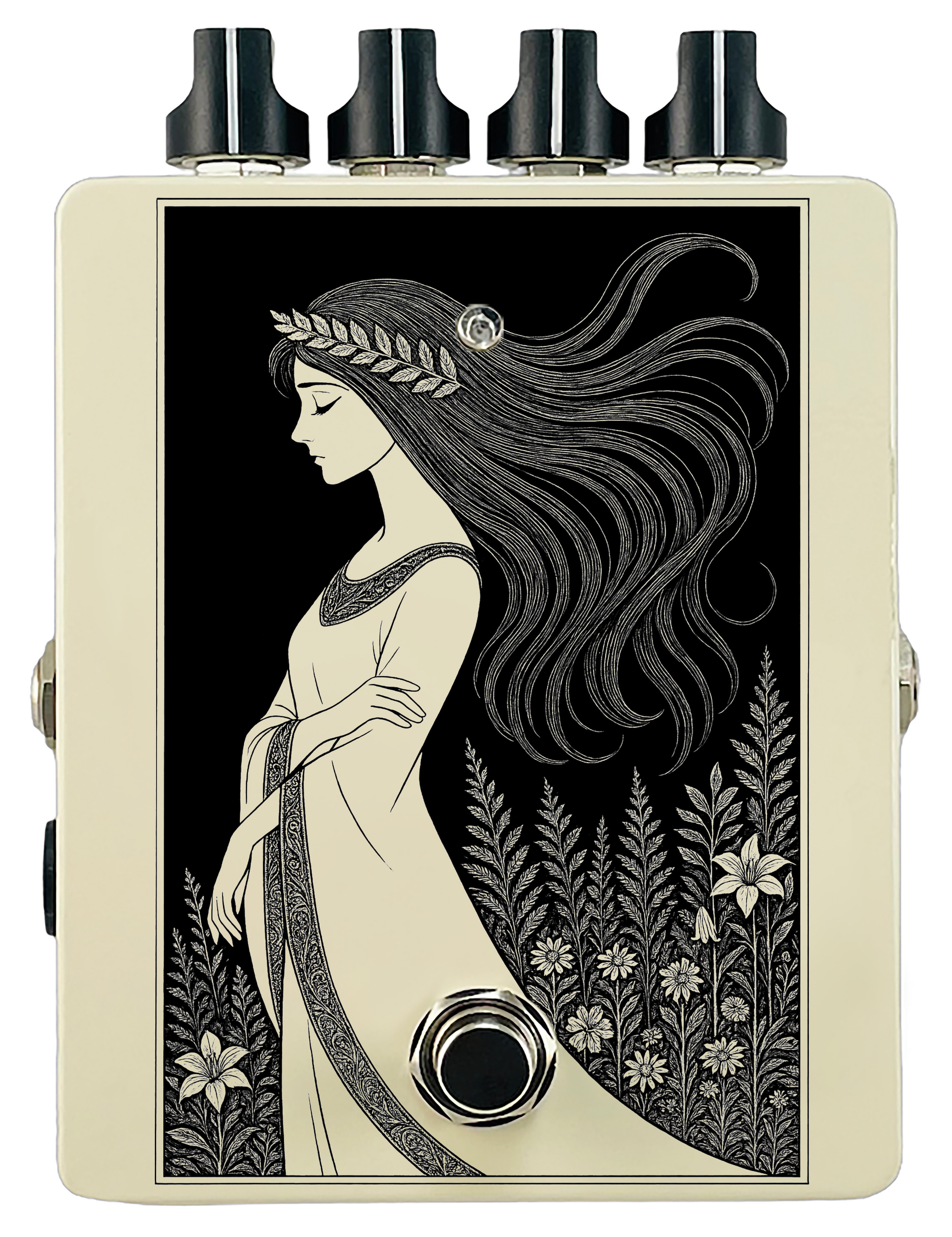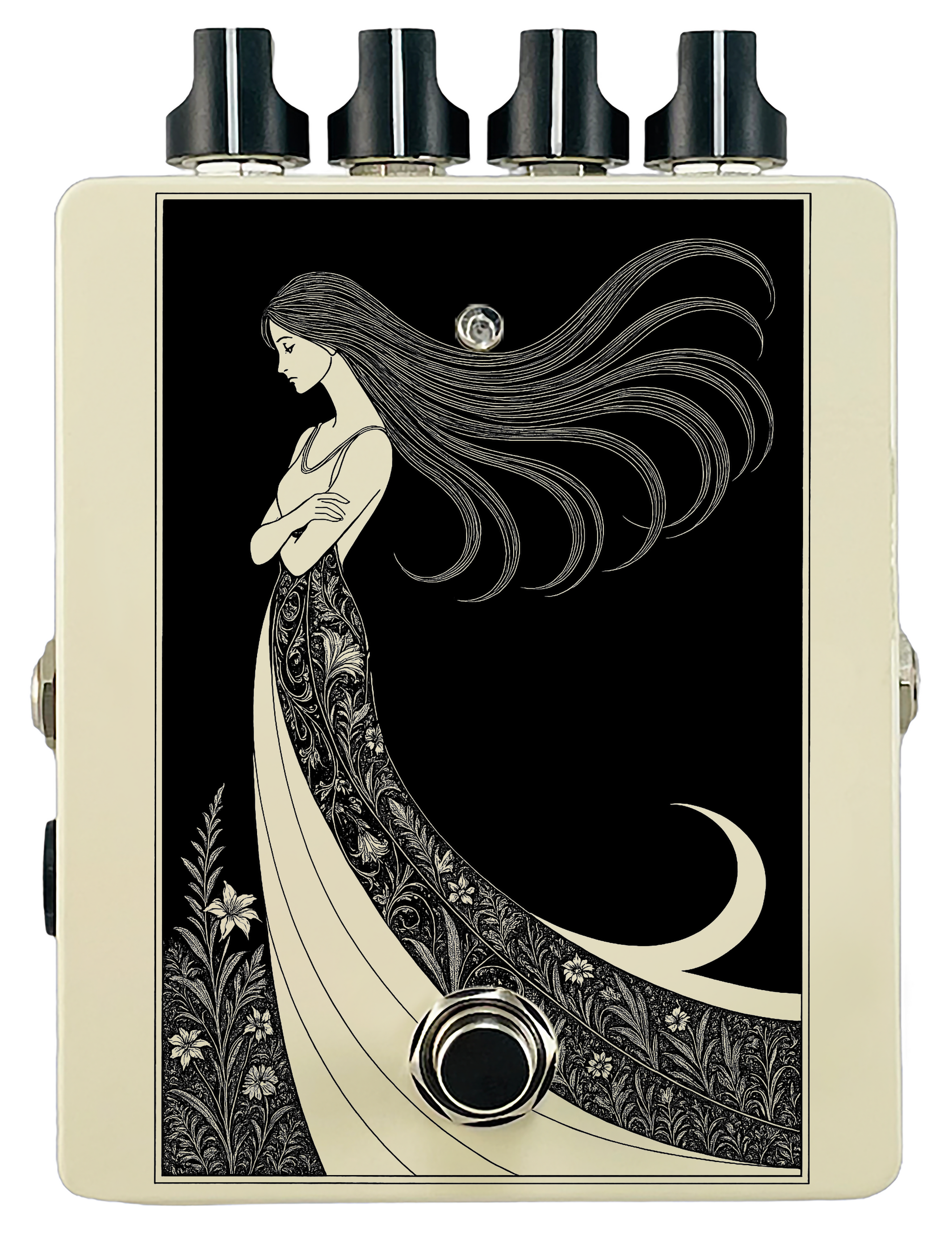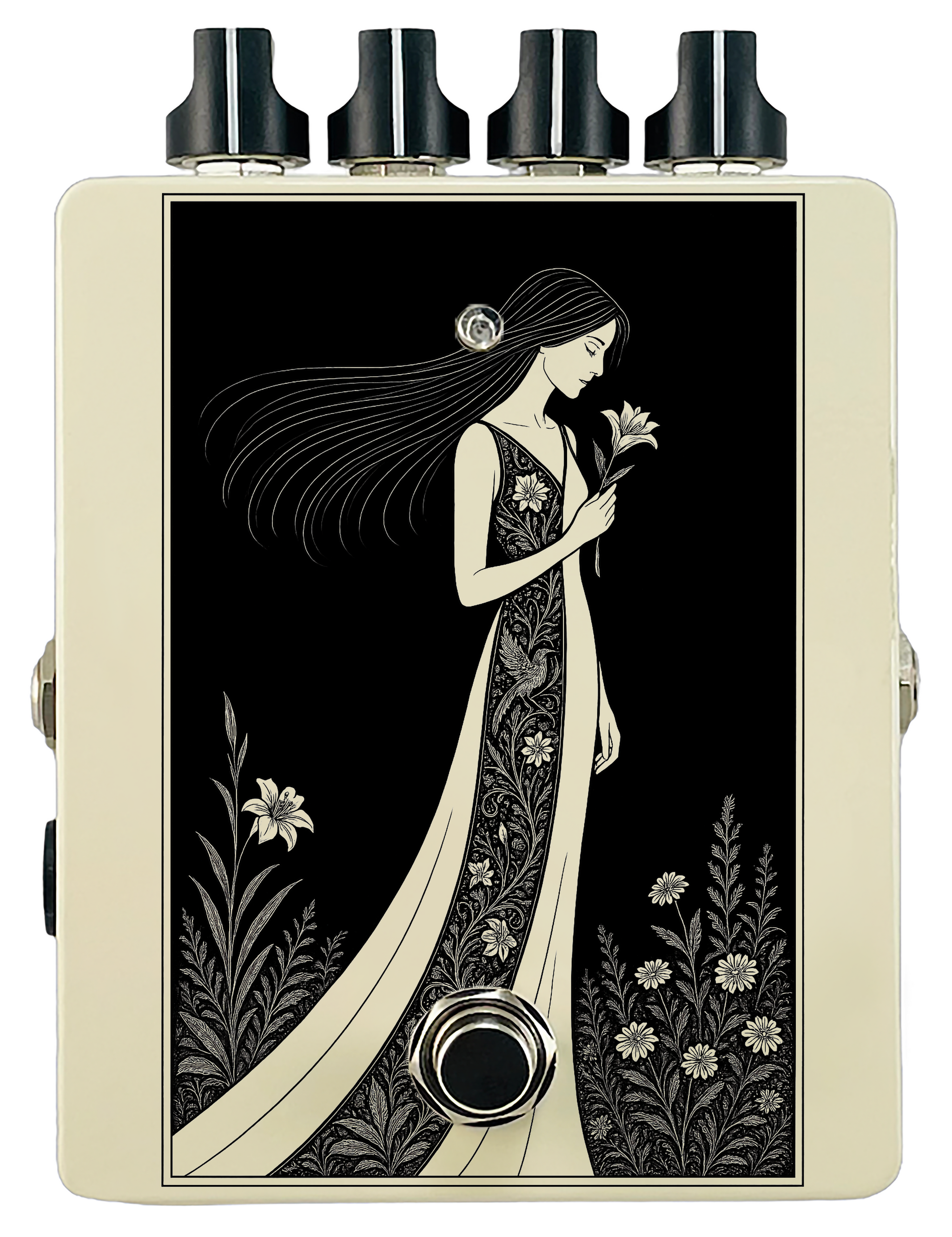 Each pedal features a unique one off piece of art drawing from the line art styles of the great Art Nouveau line artists.