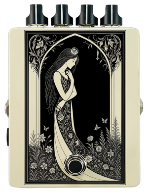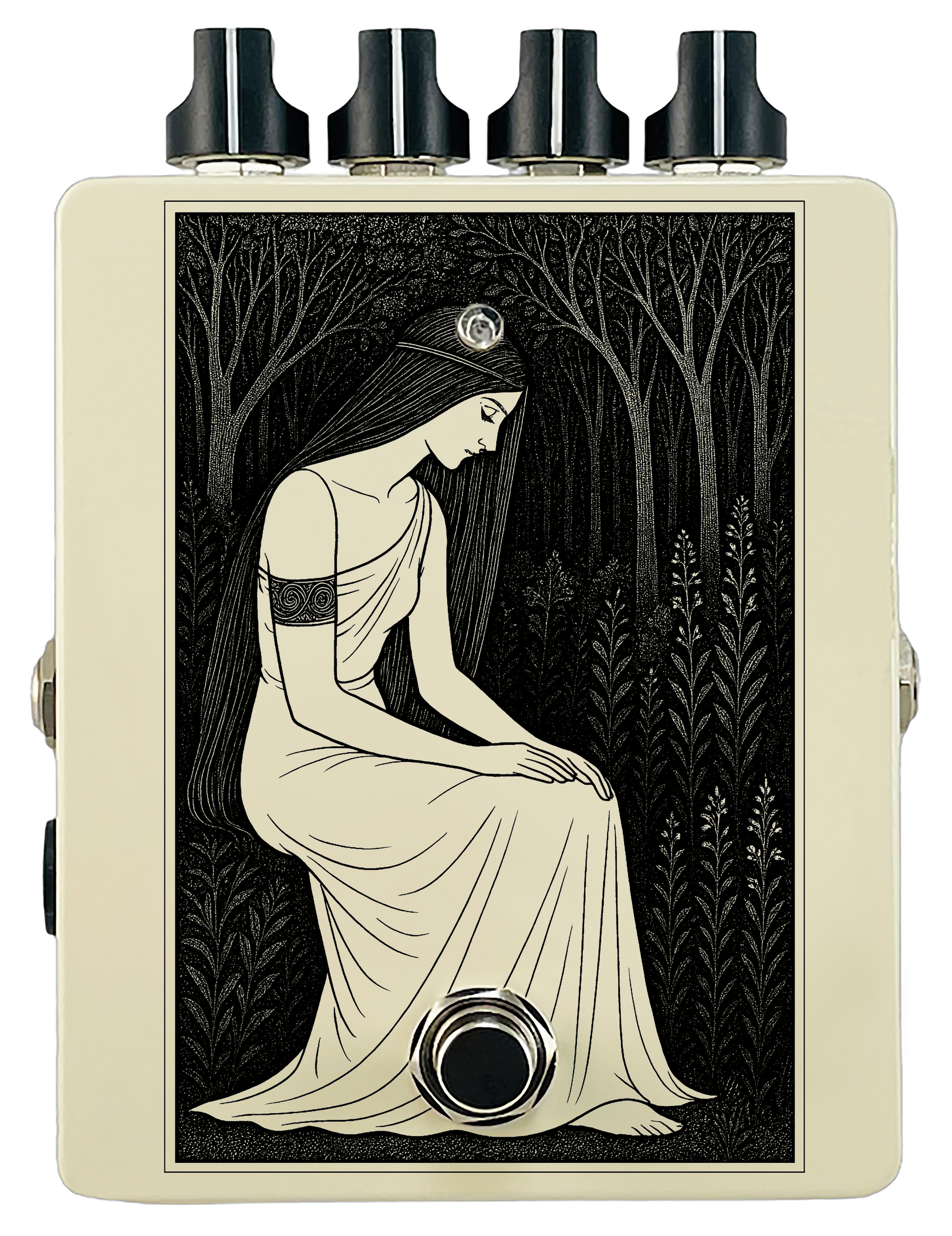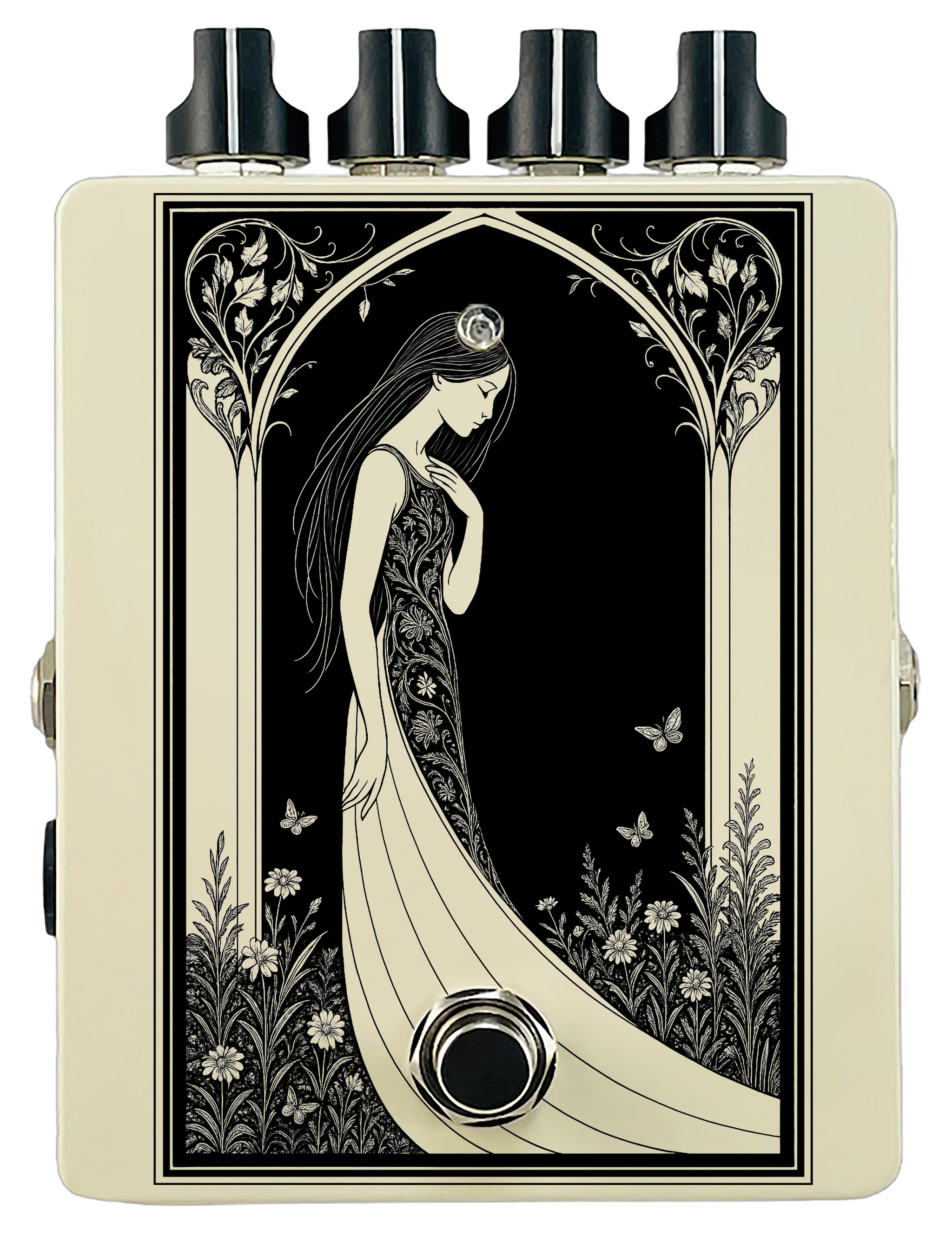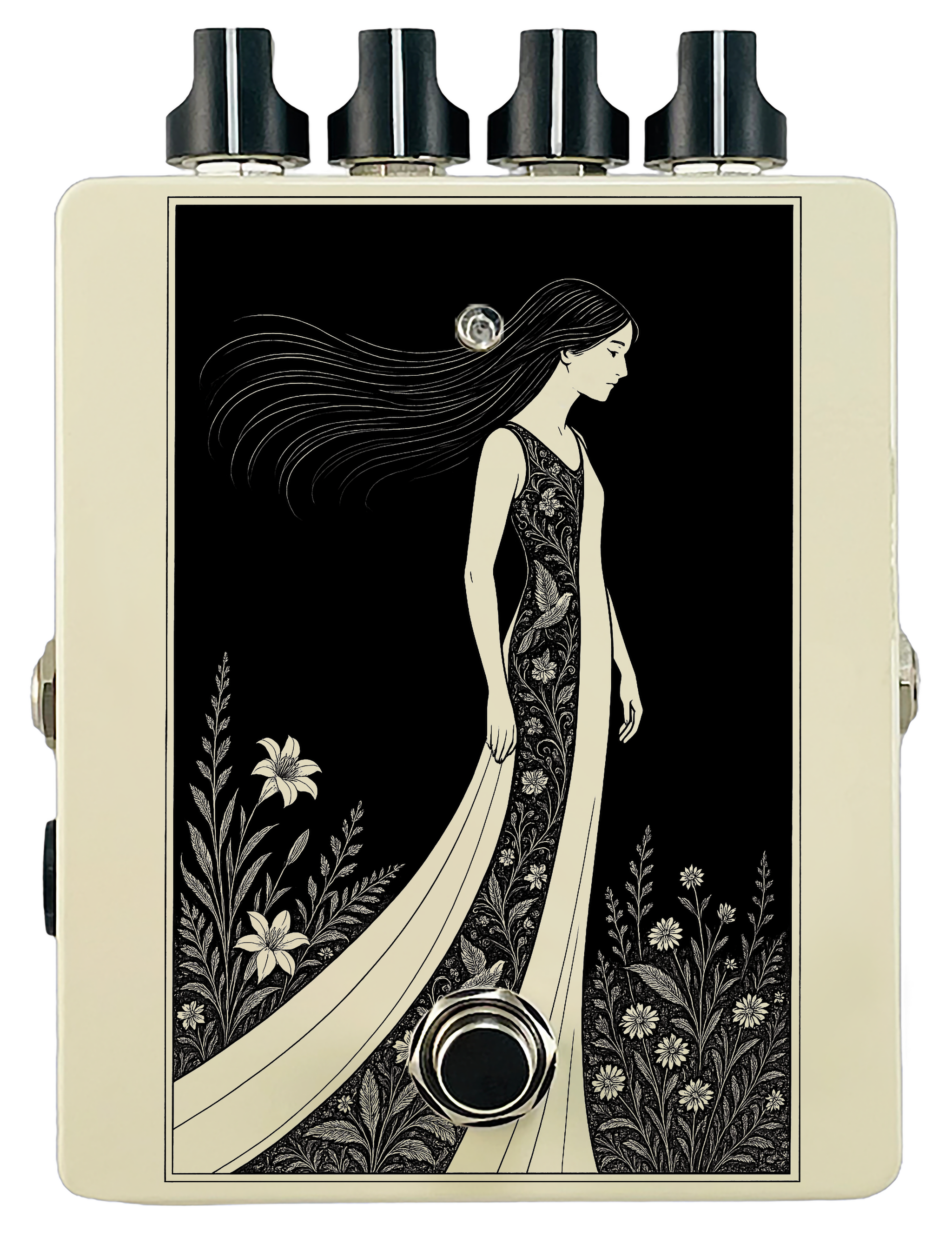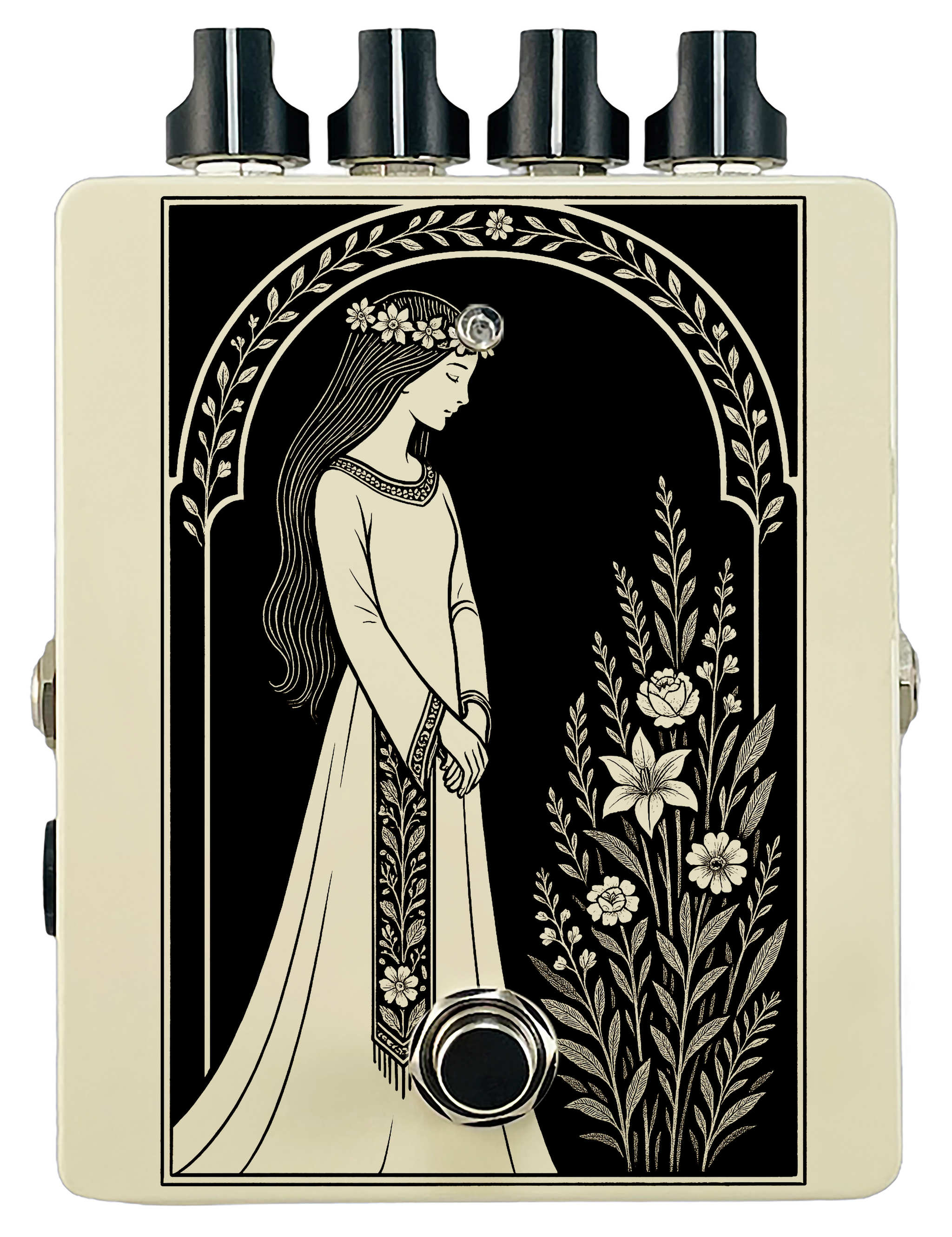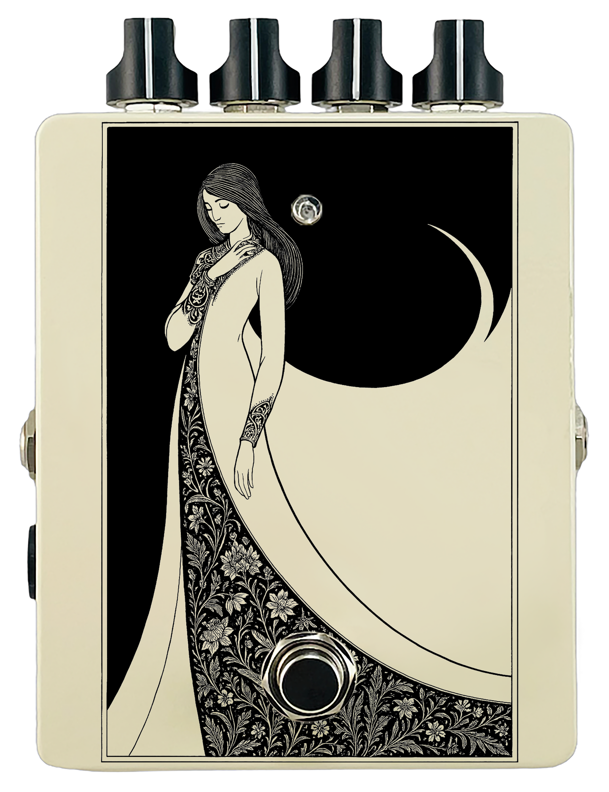 Each pedal features a unique one off piece of art drawing from the line art styles of the great Art Nouveau line artists.