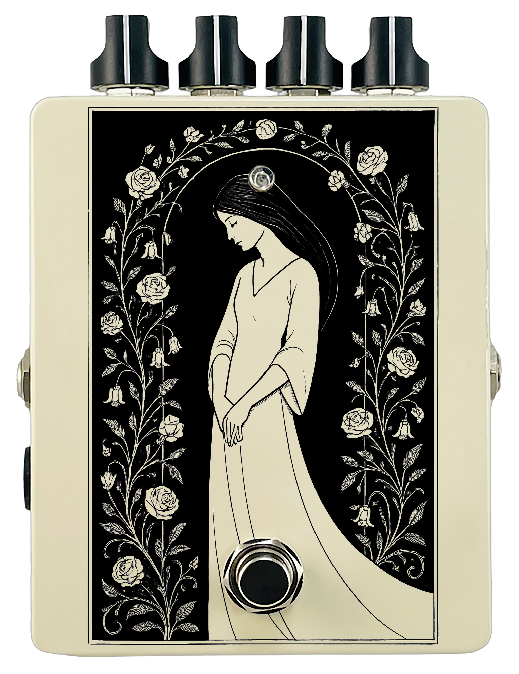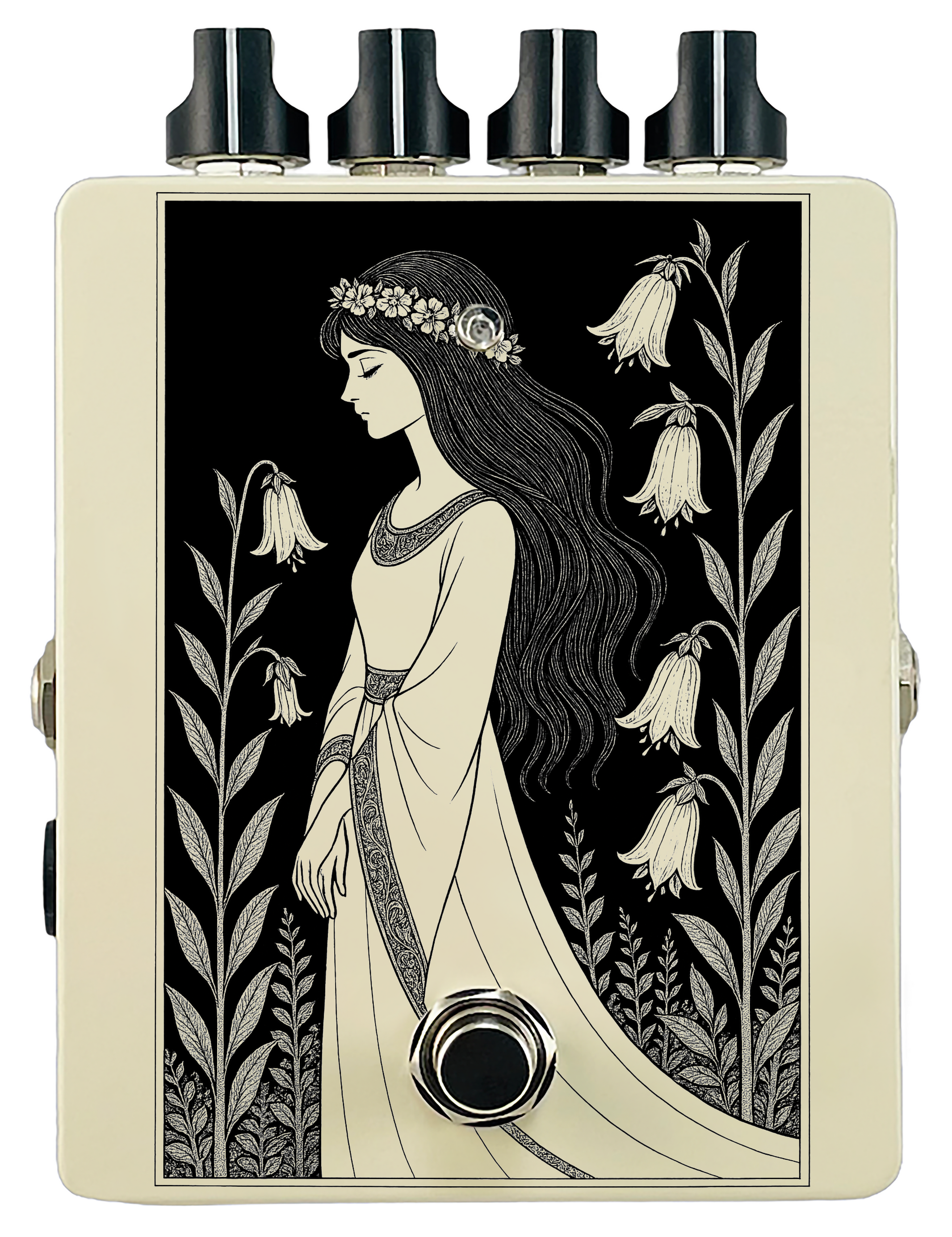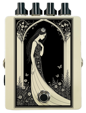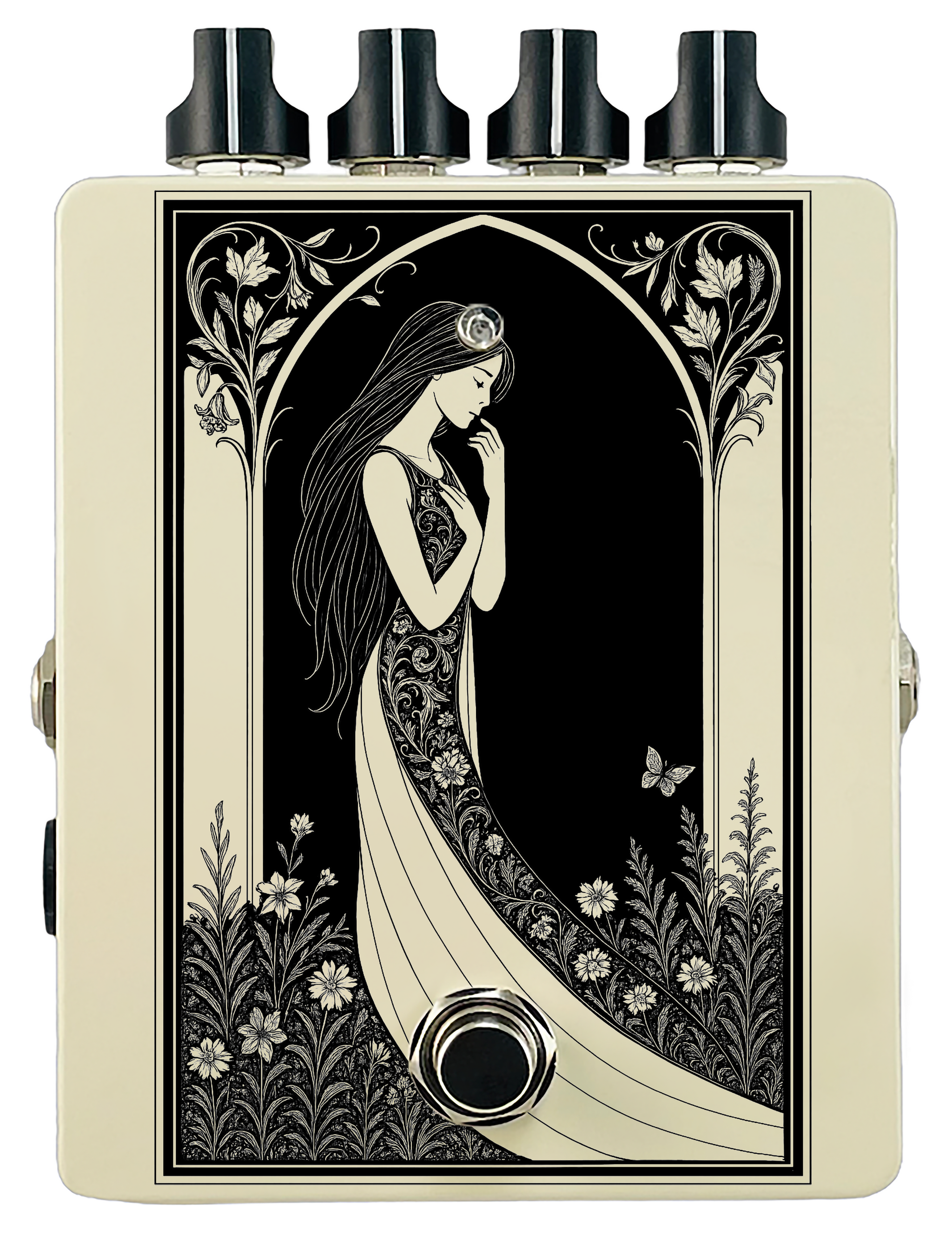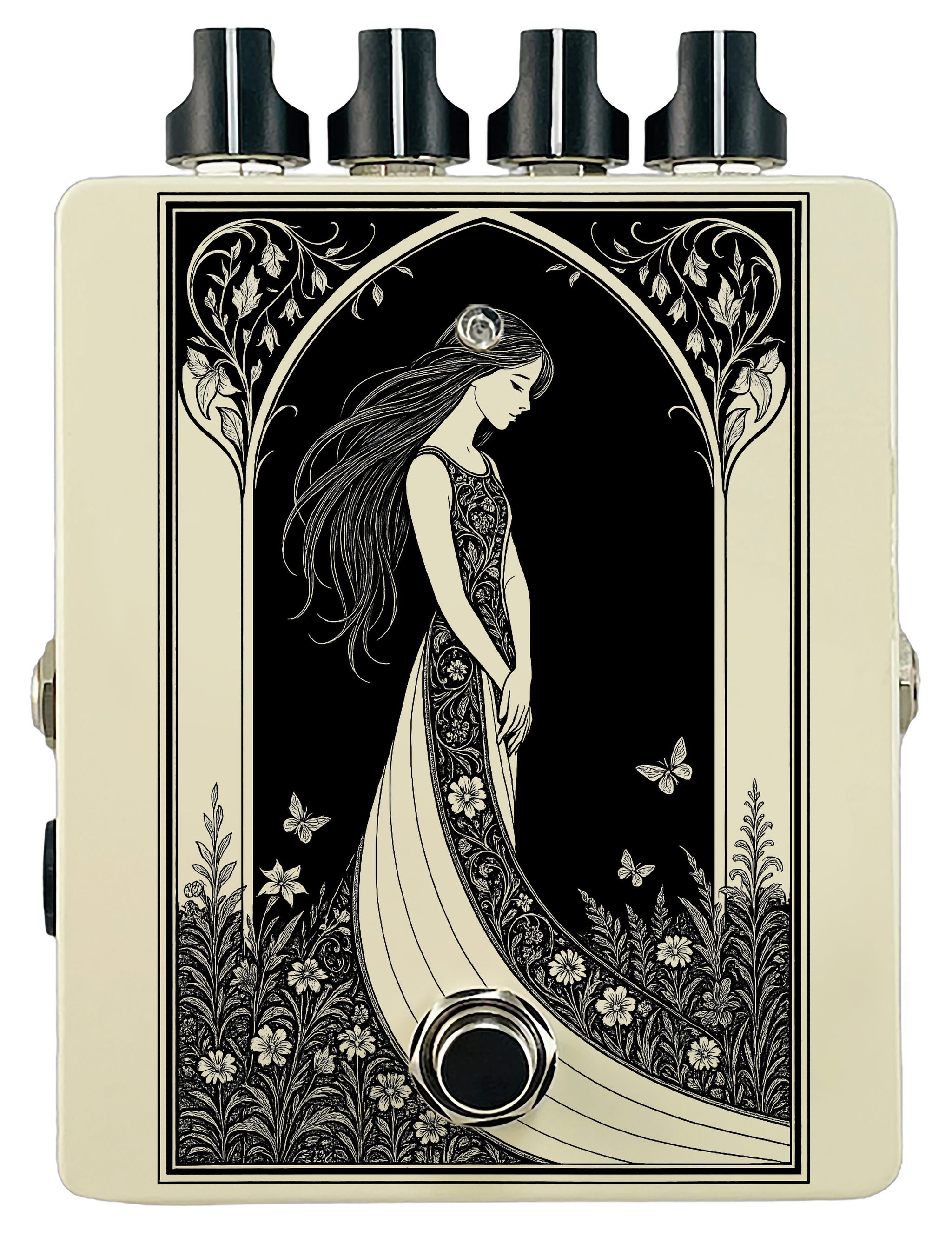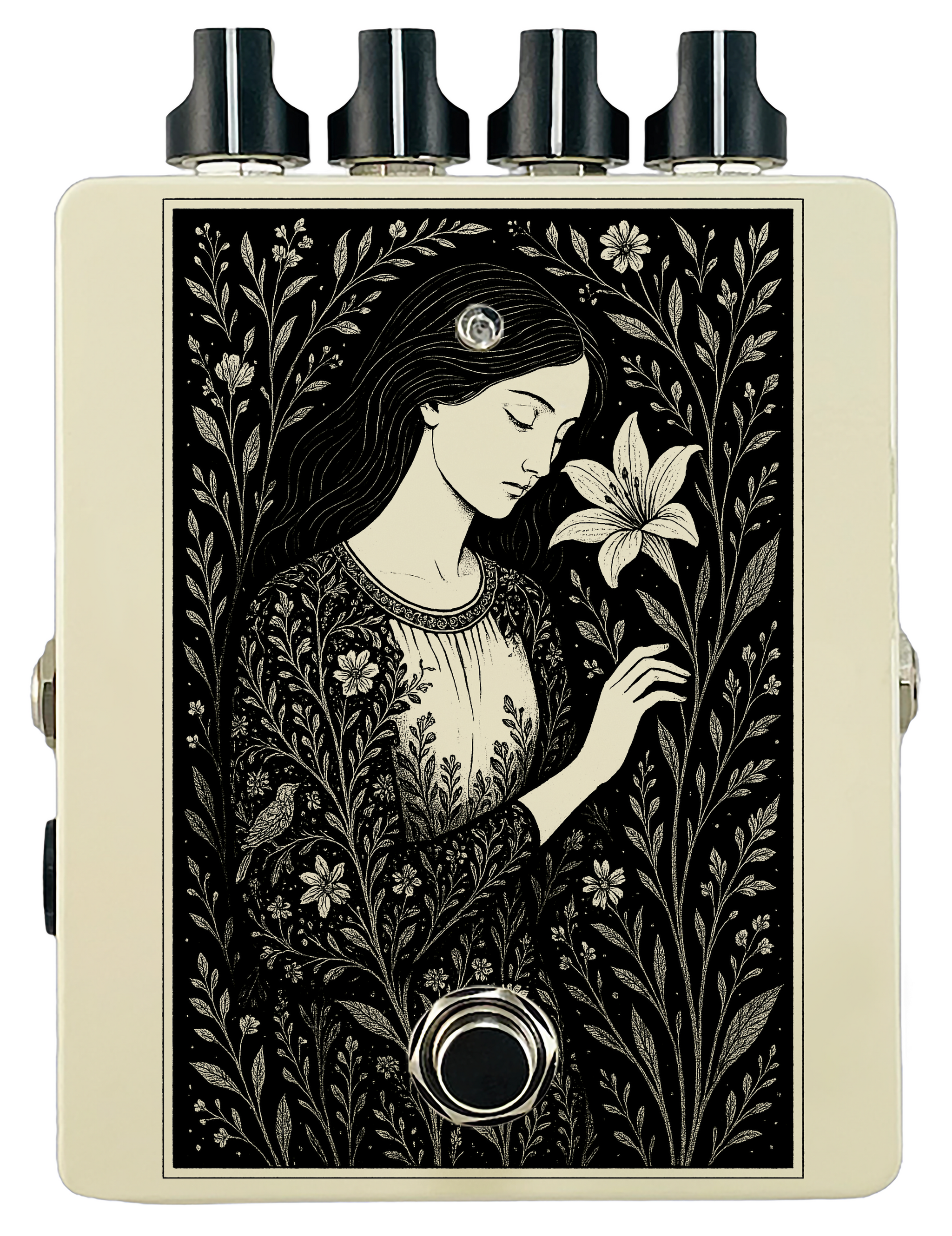 Each pedal features a unique one off piece of art drawing from the line art styles of the great Art Nouveau line artists.