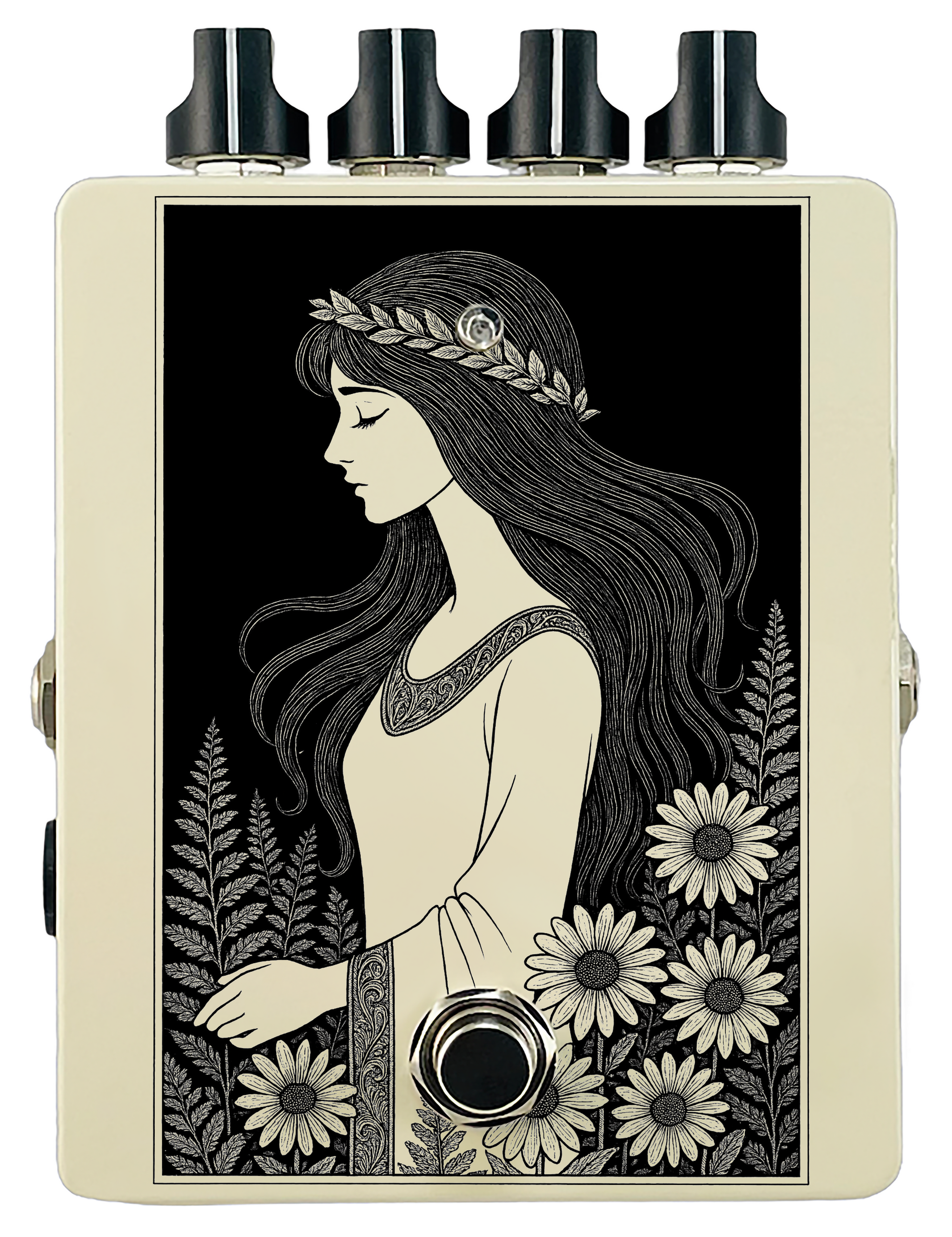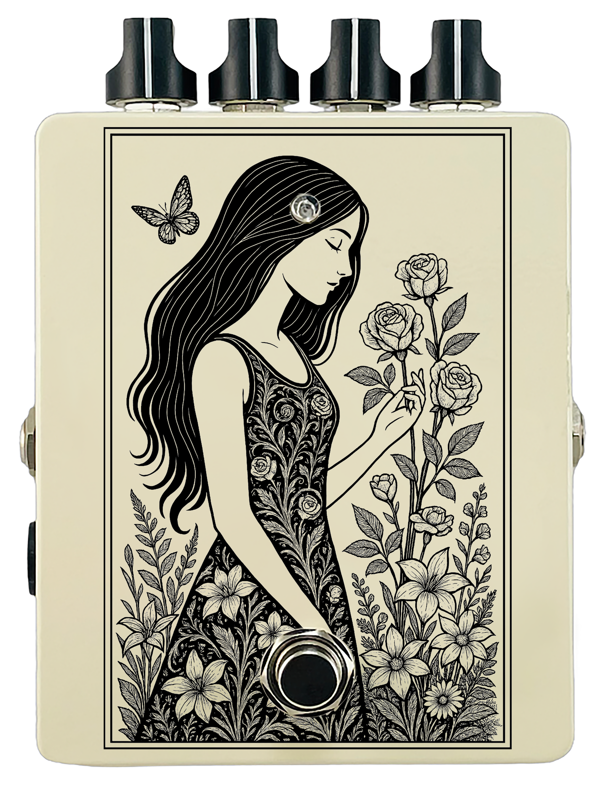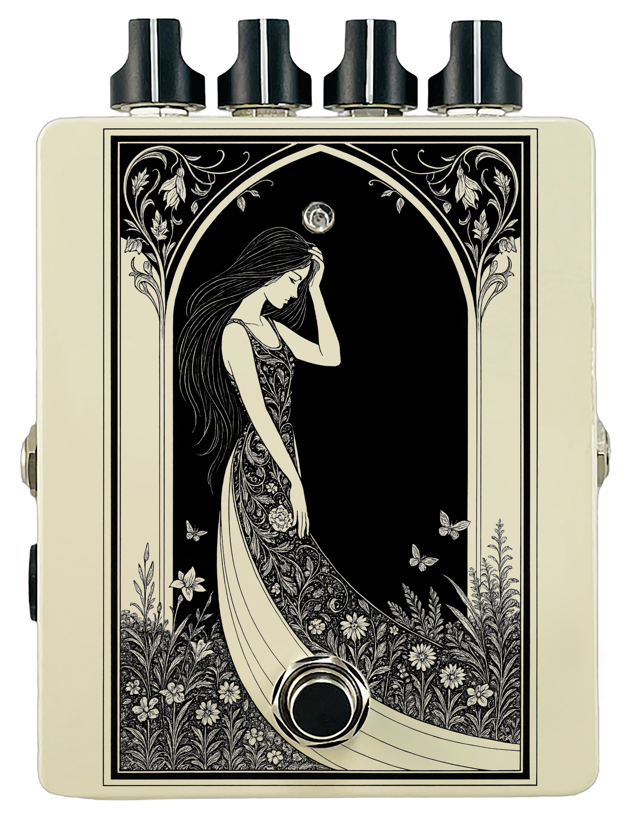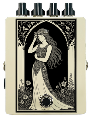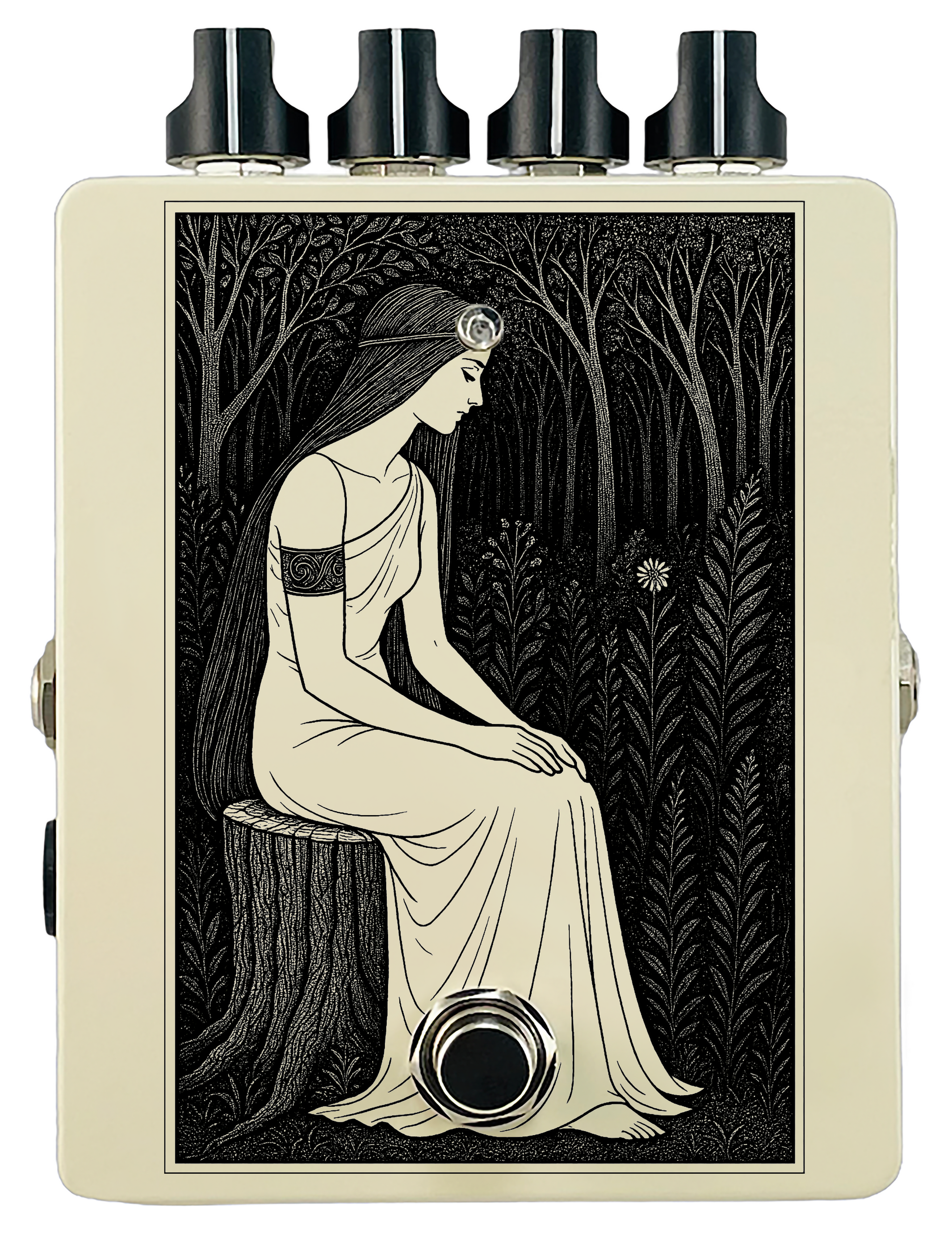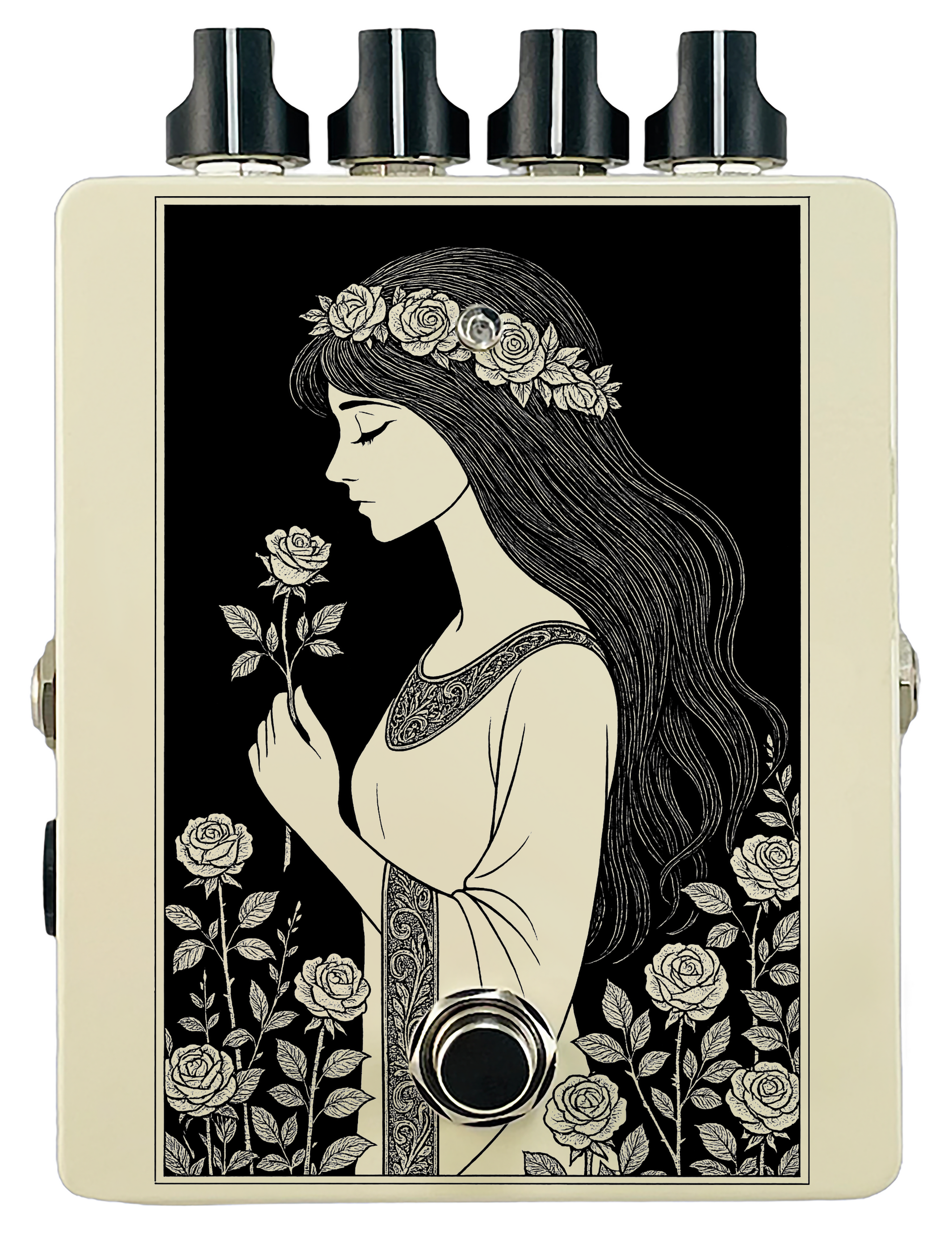 Each pedal features a unique one off piece of art drawing from the line art styles of the great Art Nouveau line artists.