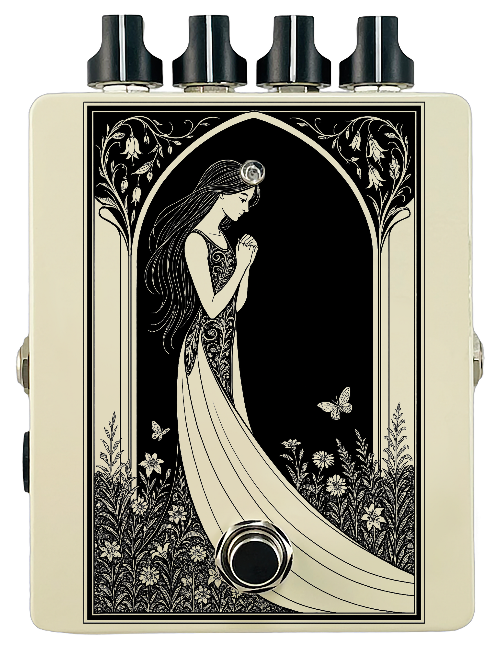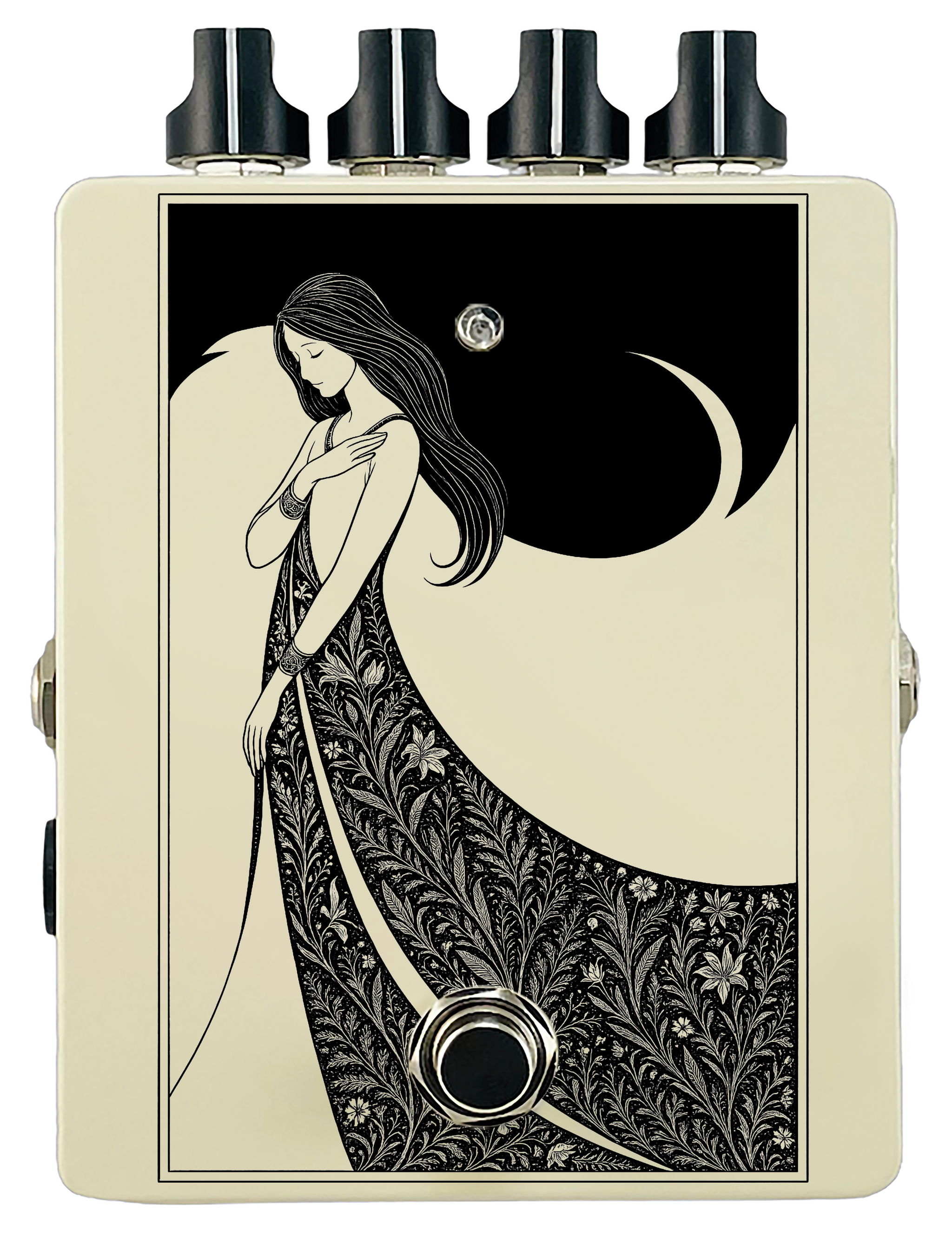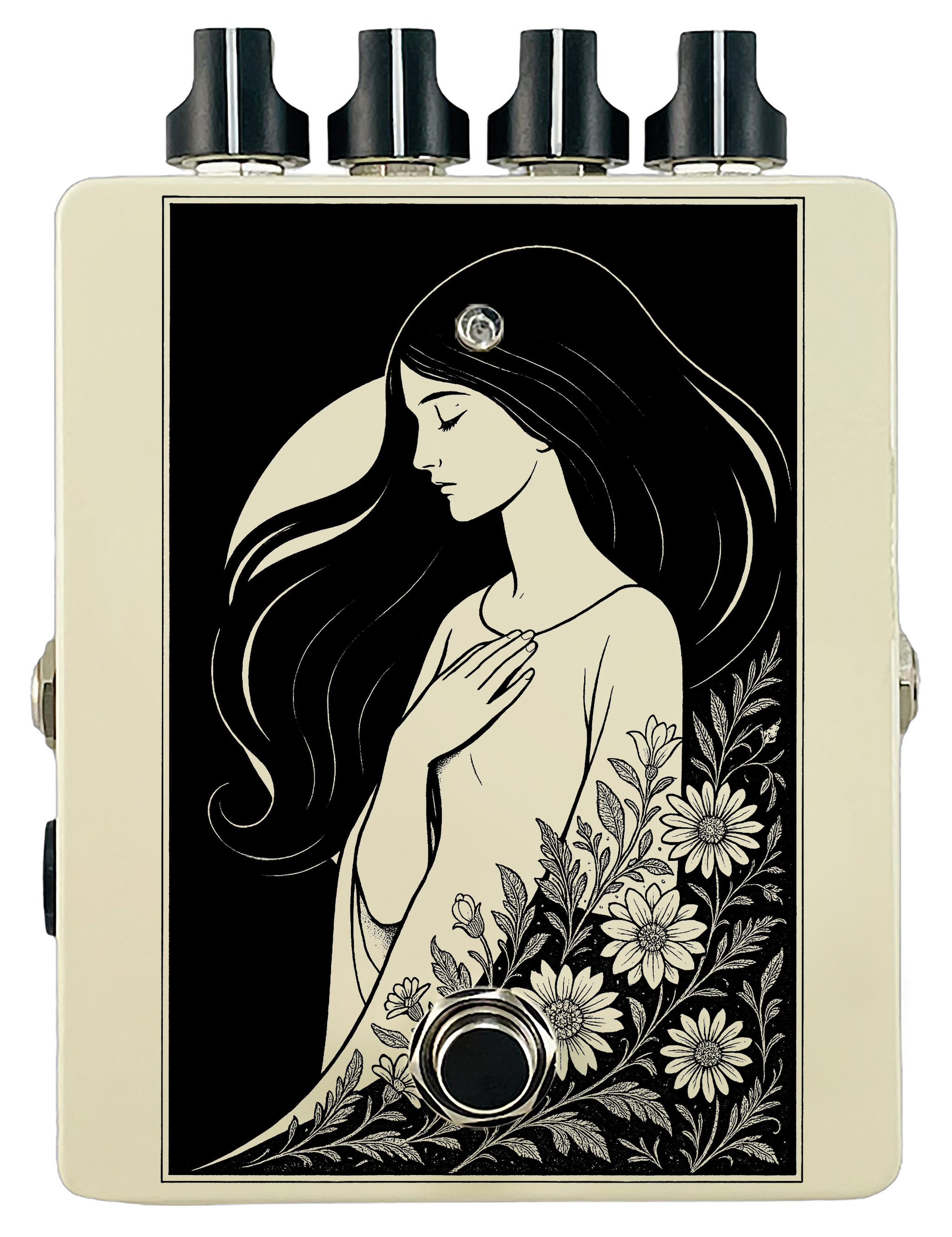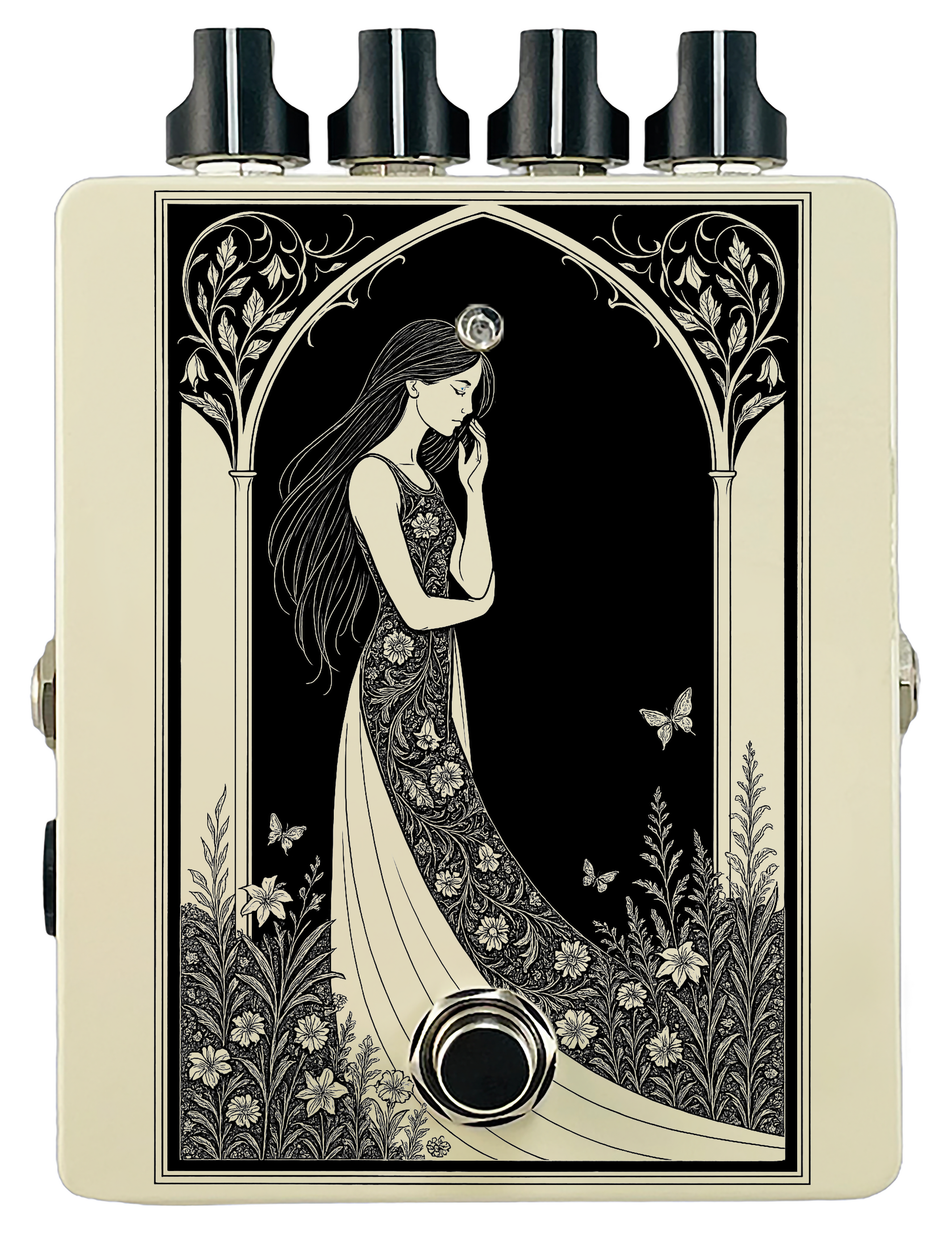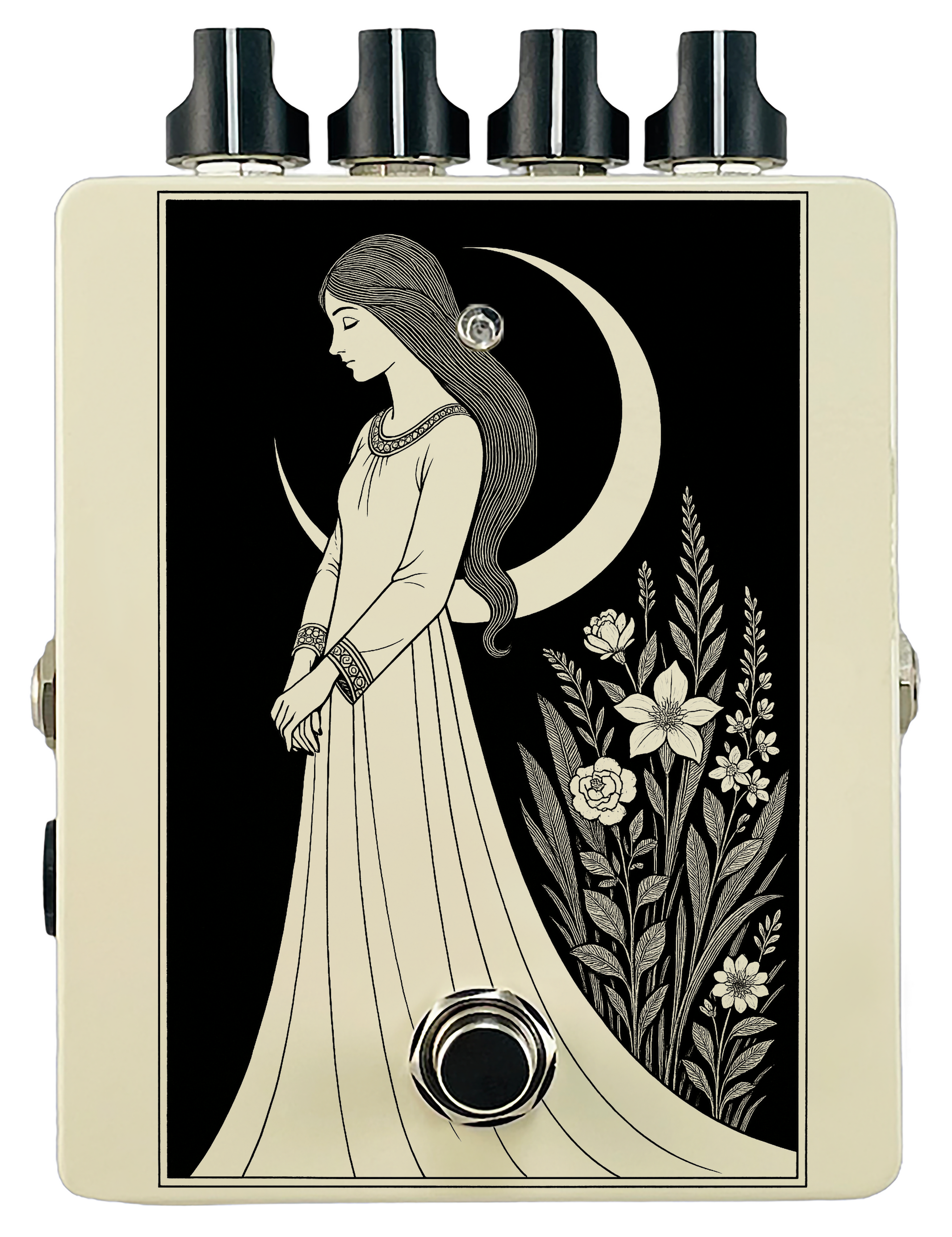 Each pedal features a unique one off piece of art drawing from the line art styles of the great Art Nouveau line artists.