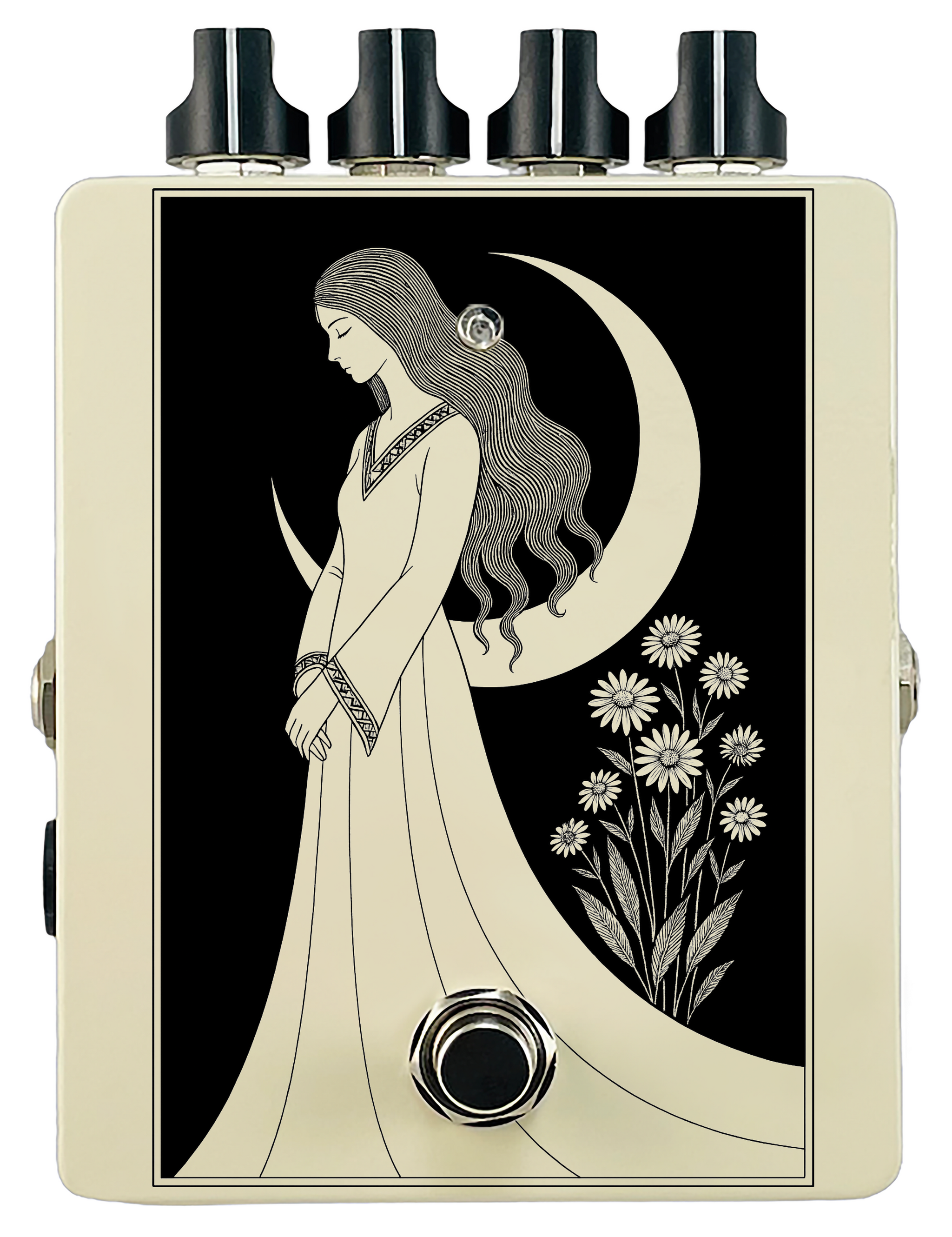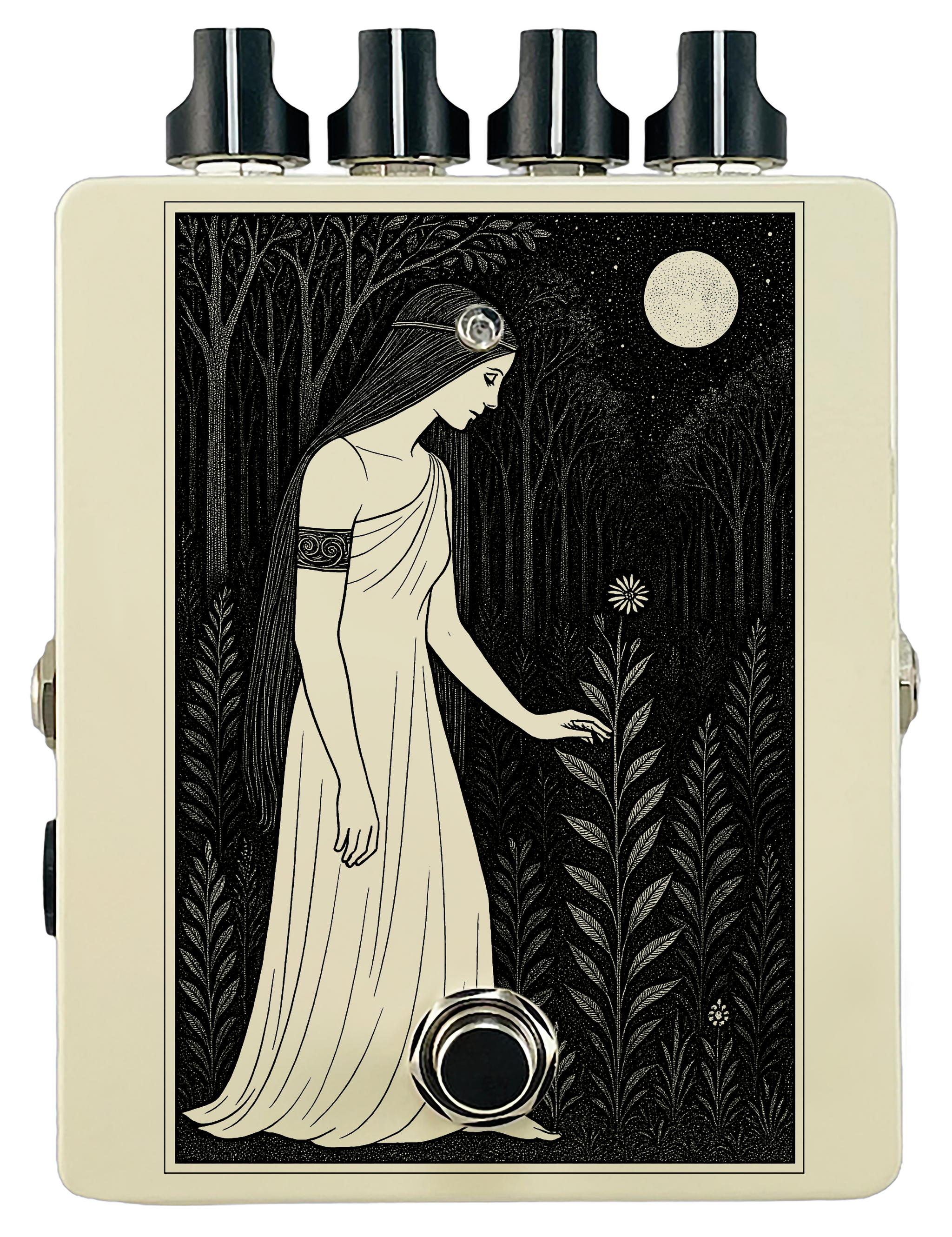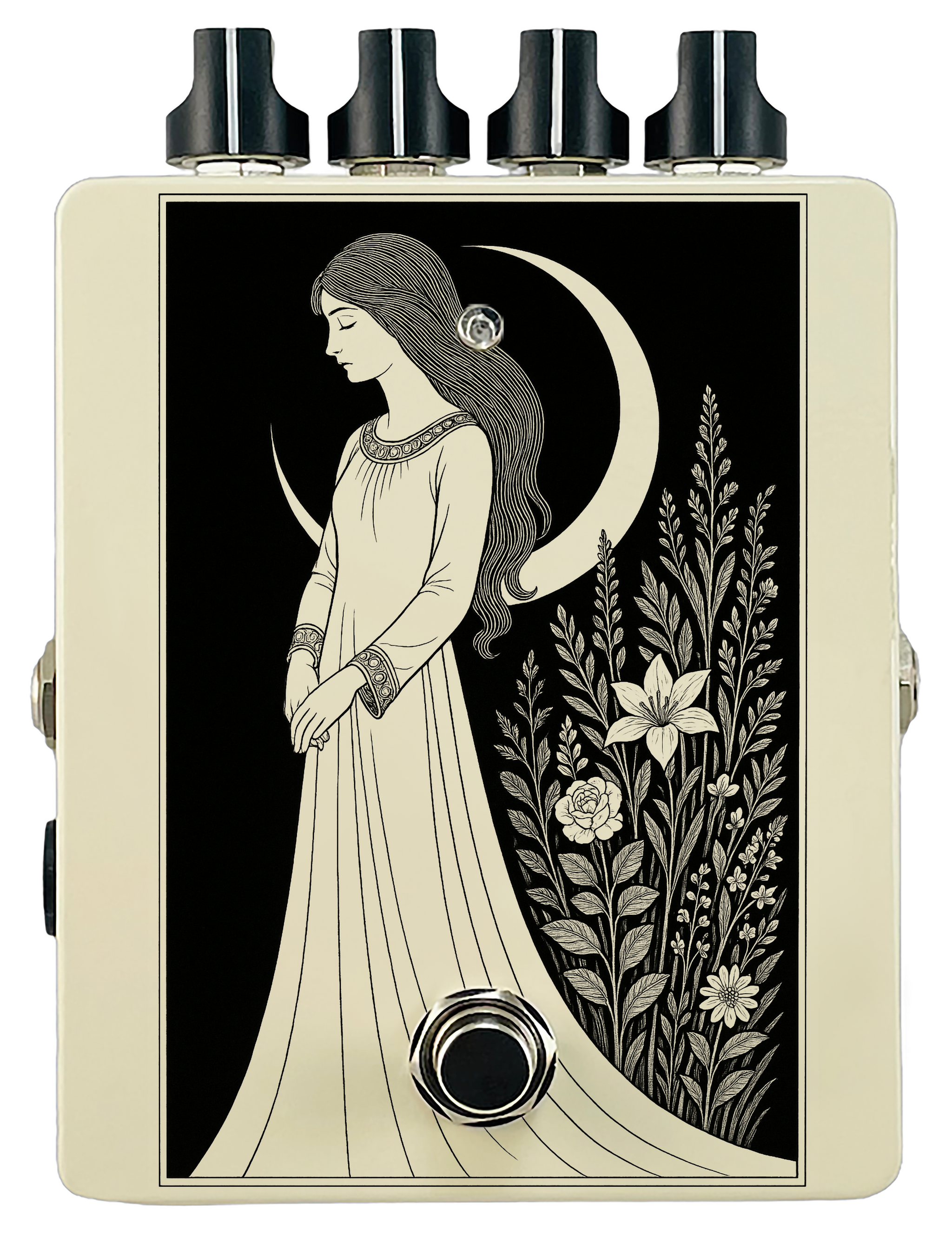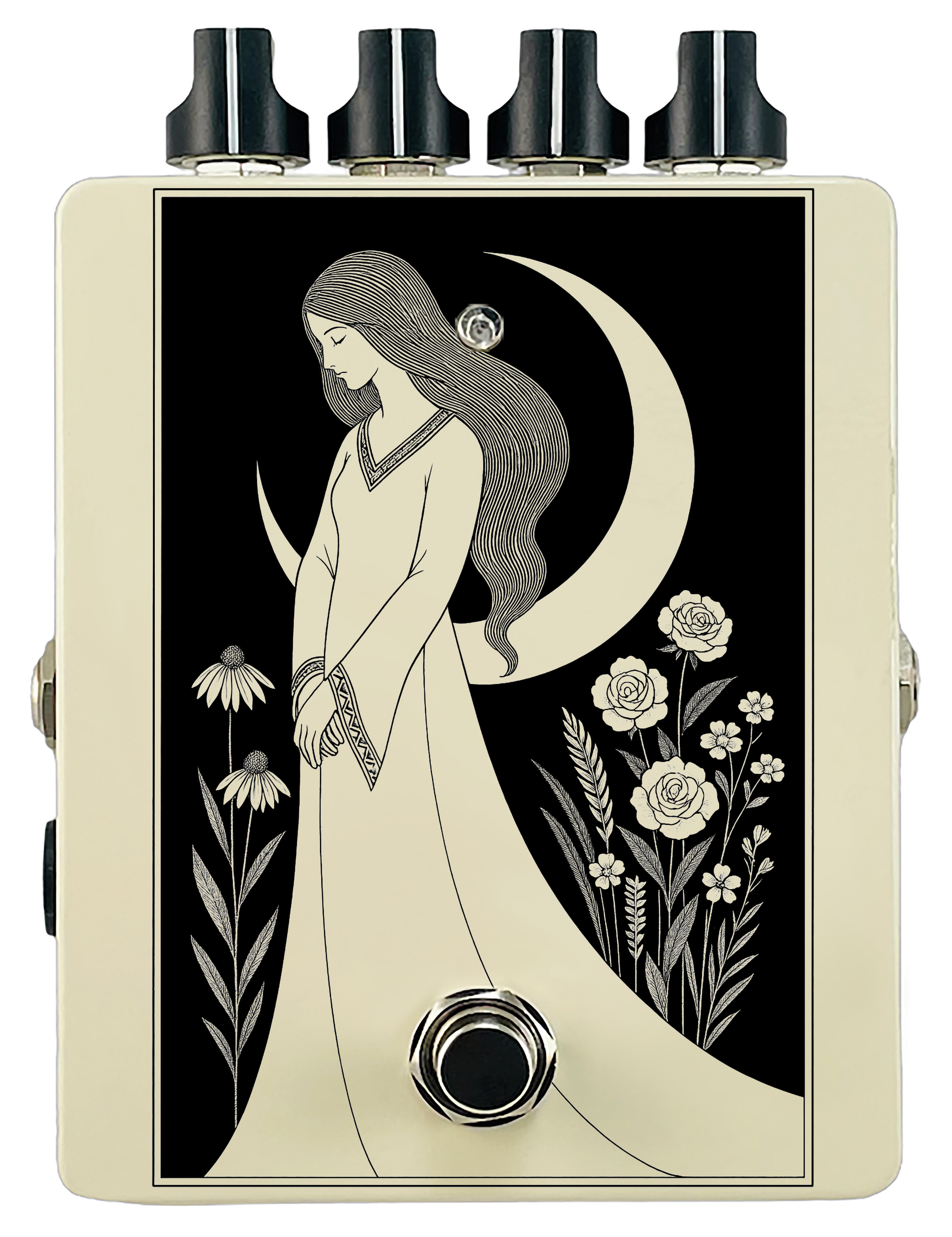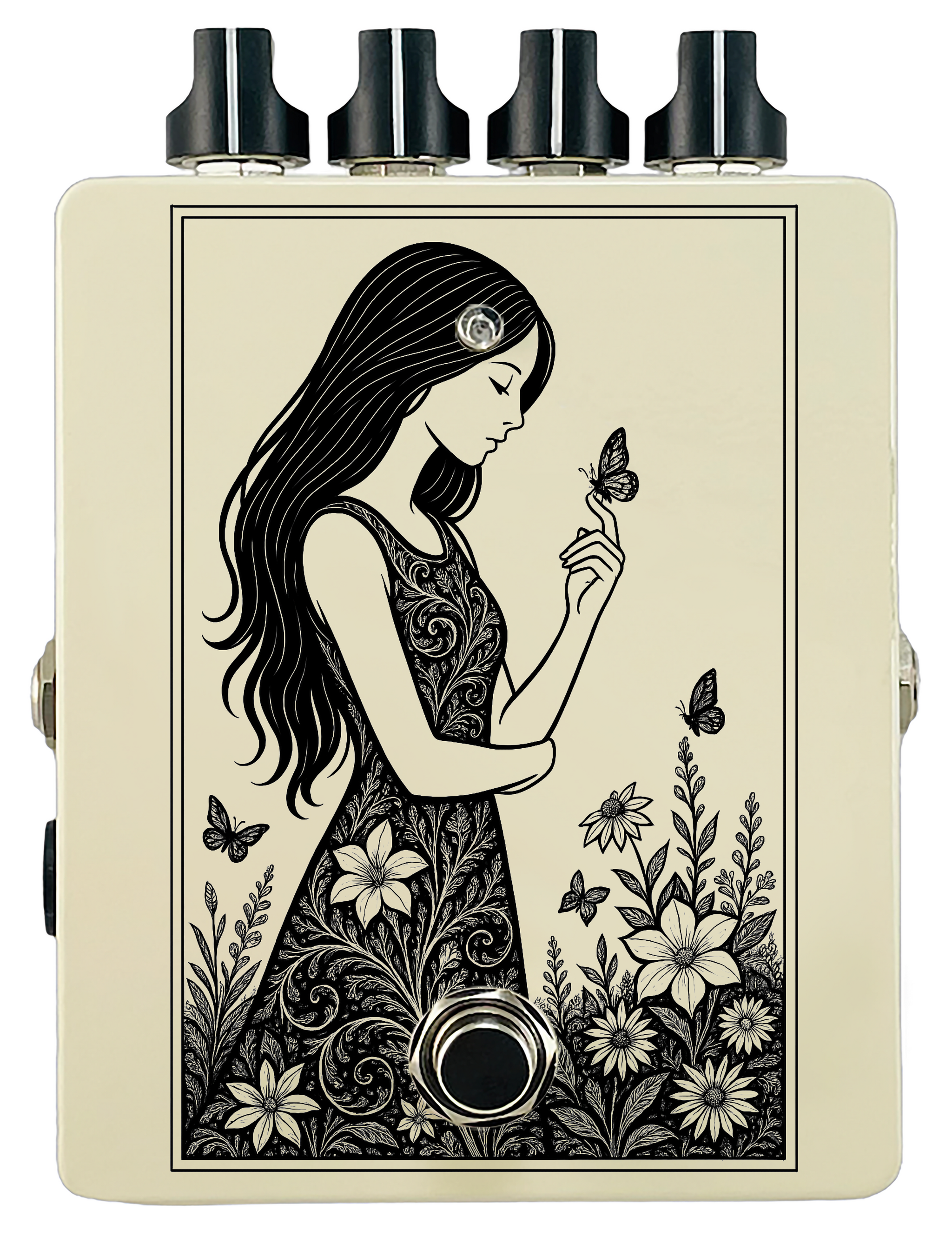Each pedal features a unique one off piece of art drawing from the line art styles of the great Art Nouveau line artists.