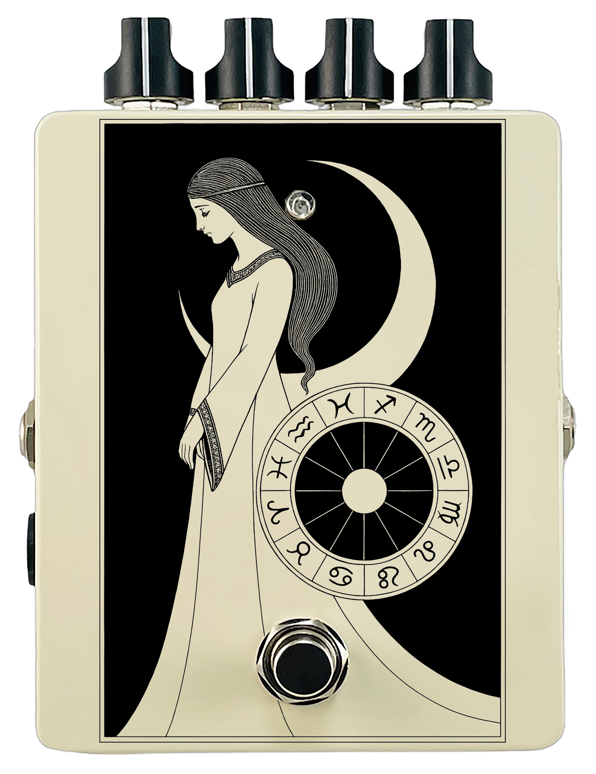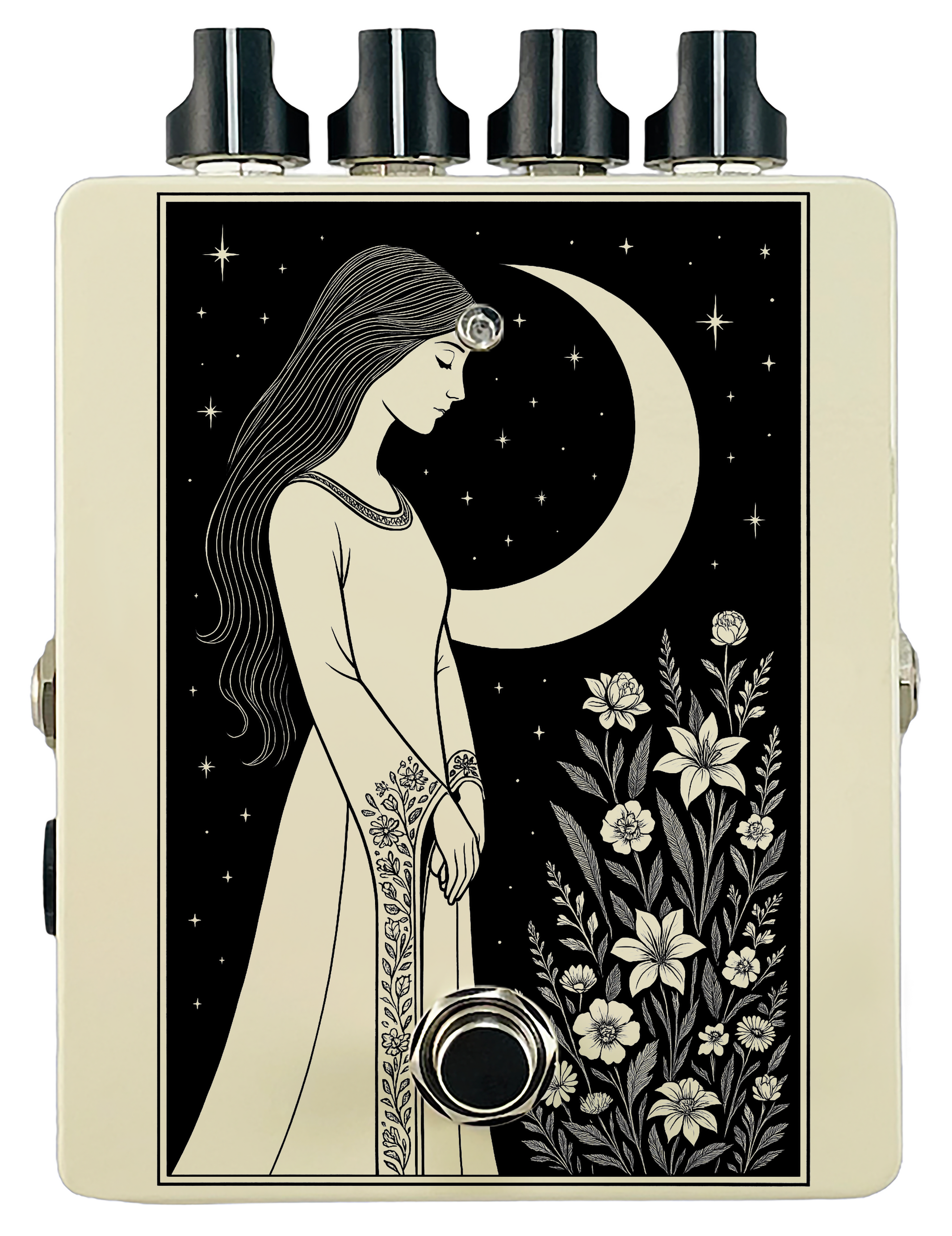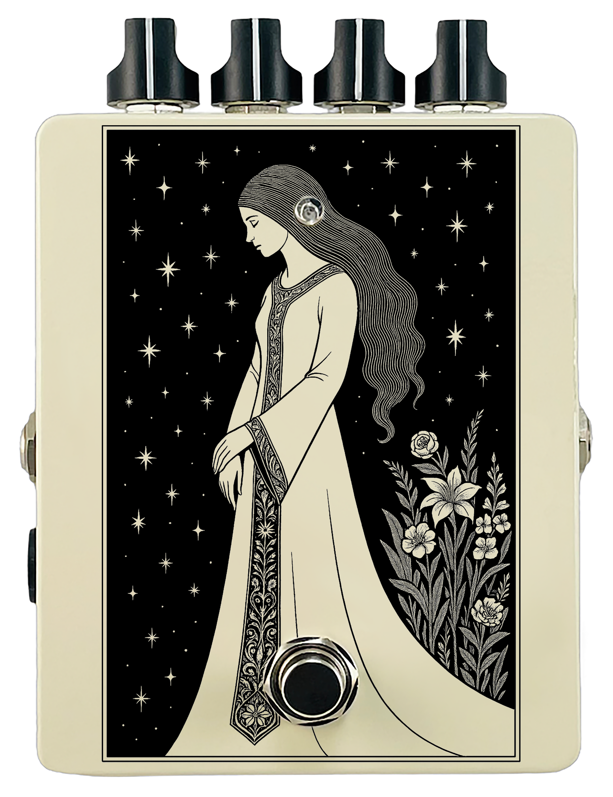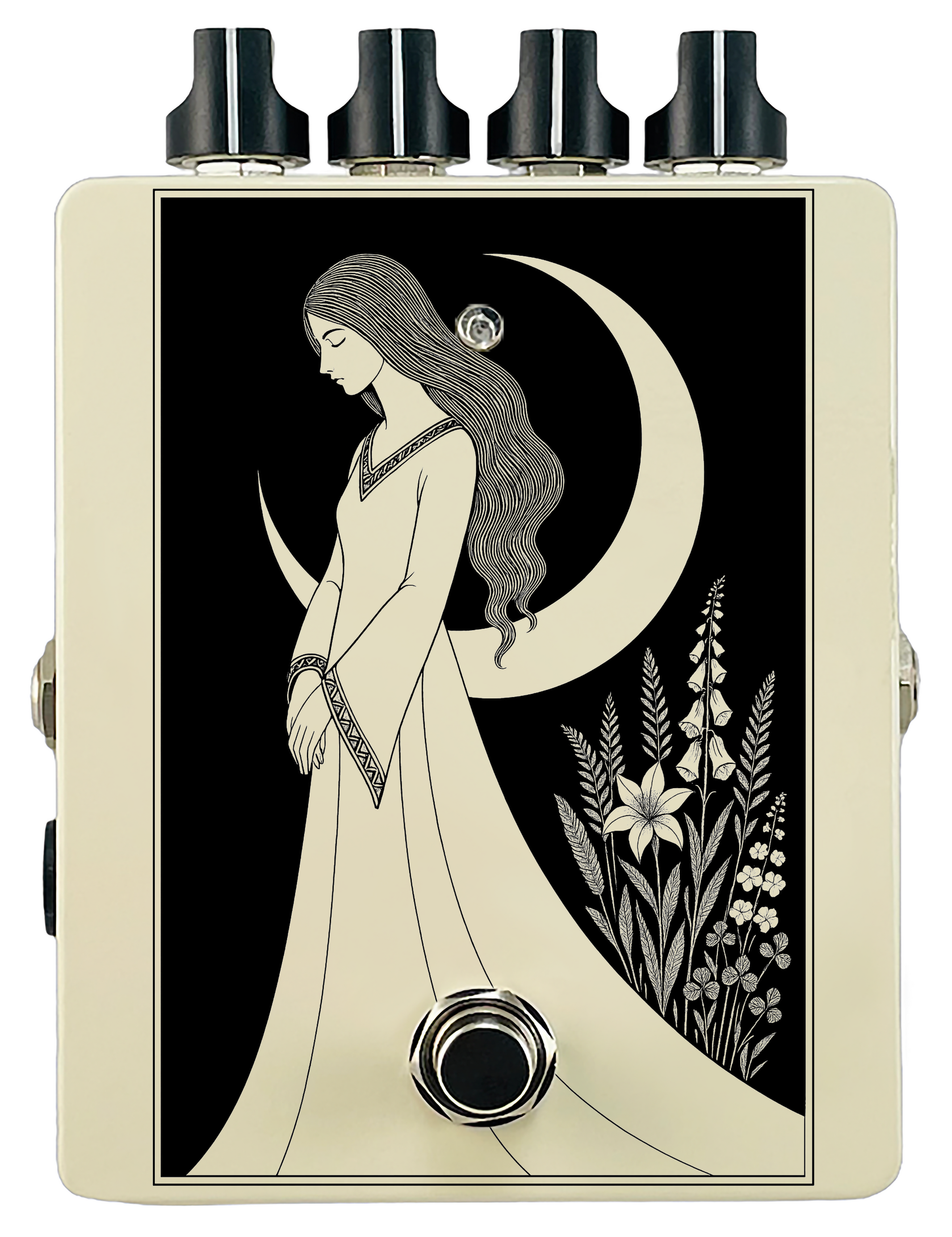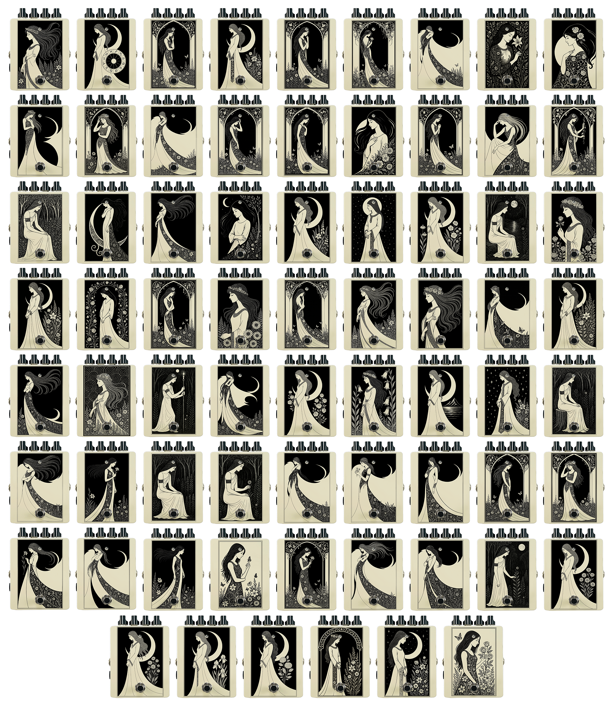 Each pedal features a unique one off piece of art drawing from the line art styles of the great Art Nouveau line artists.